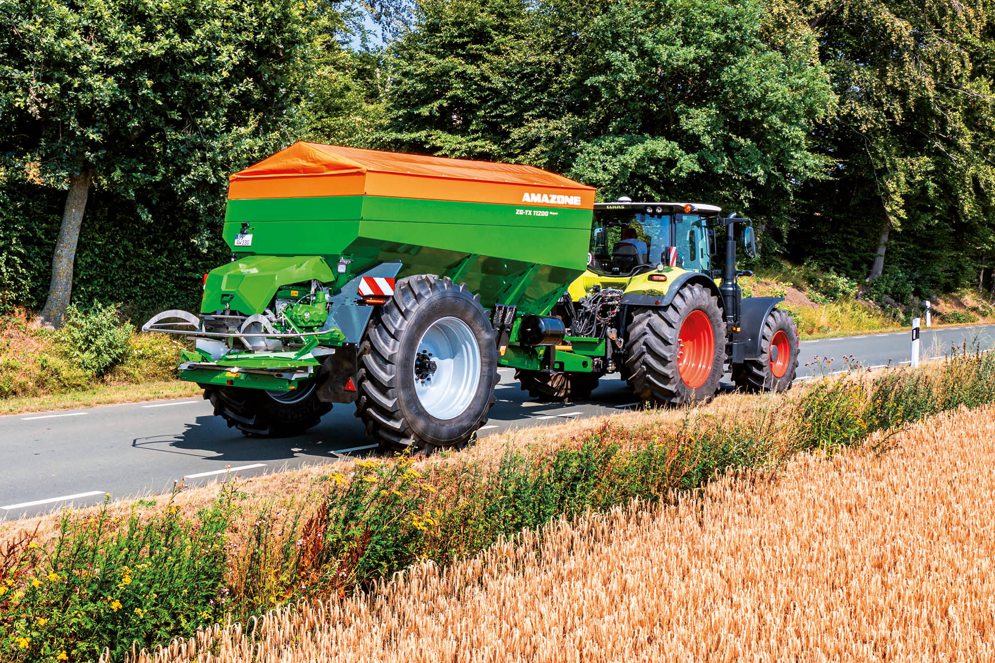 The ZG-TX trailed spreaders, equipped with the optional steering axle, provides a maximum steering angle of up to 20°. As a result, crop-friendly track-following is possible, depending on the track width. The automatic steering even allows counter-steering on slopes. As soon as the spreading disc drive has been deactivated and a speed of 15 km/h is exceeded, the steering automatically stops to ensure the safe road transport at speeds of up to 40 km/h.