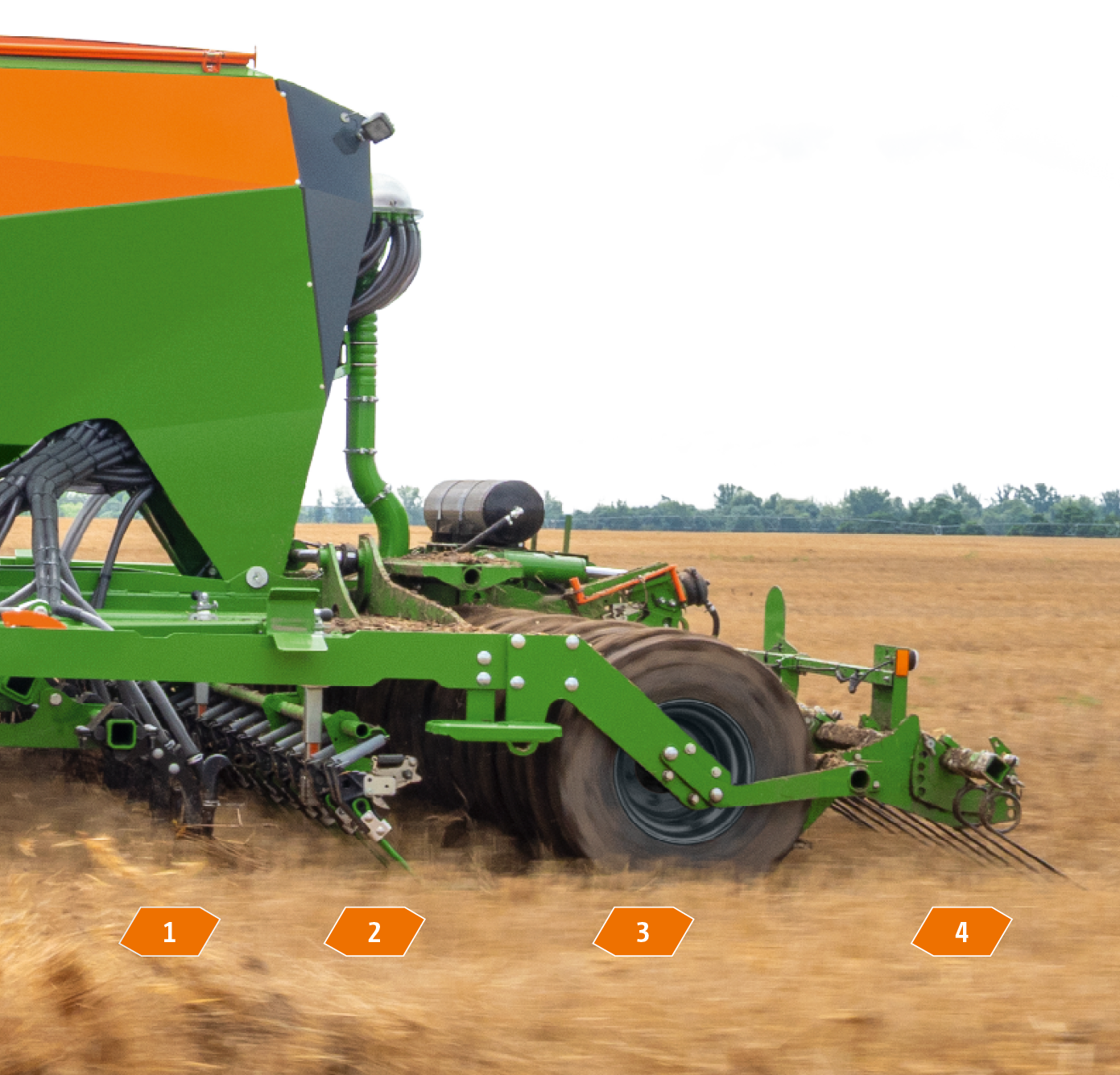 After seed placement, the seed furrow is closed and the soil is levelled by the Exact harrow.