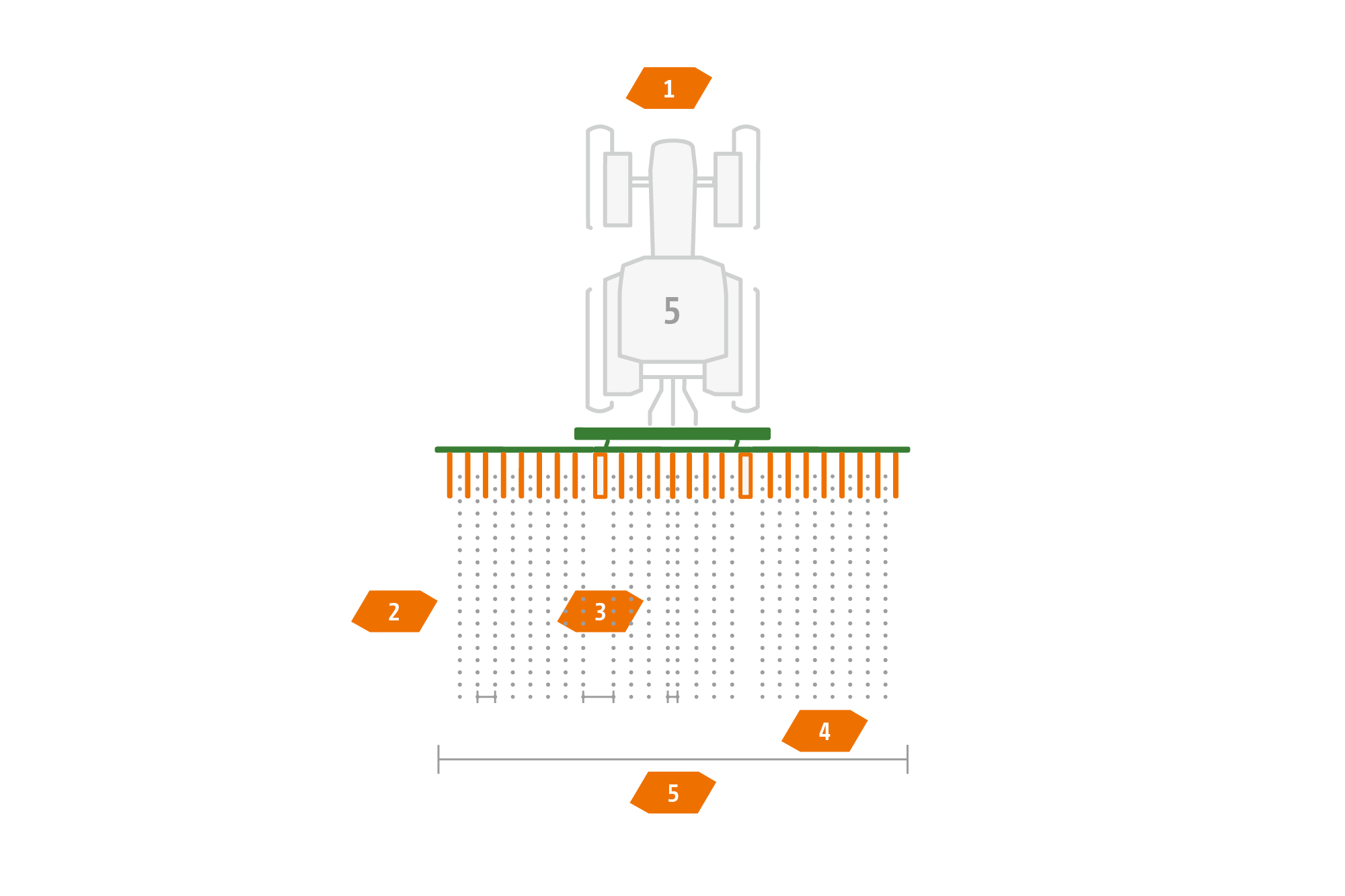 In this example, the distance between seed rows 6 and 7 from the first and second passes for sowing is 75 cm + 3 cm, while the distance between seed rows 12 and 13 from the second and third passes for sowing is 75 cm - 3 cm.