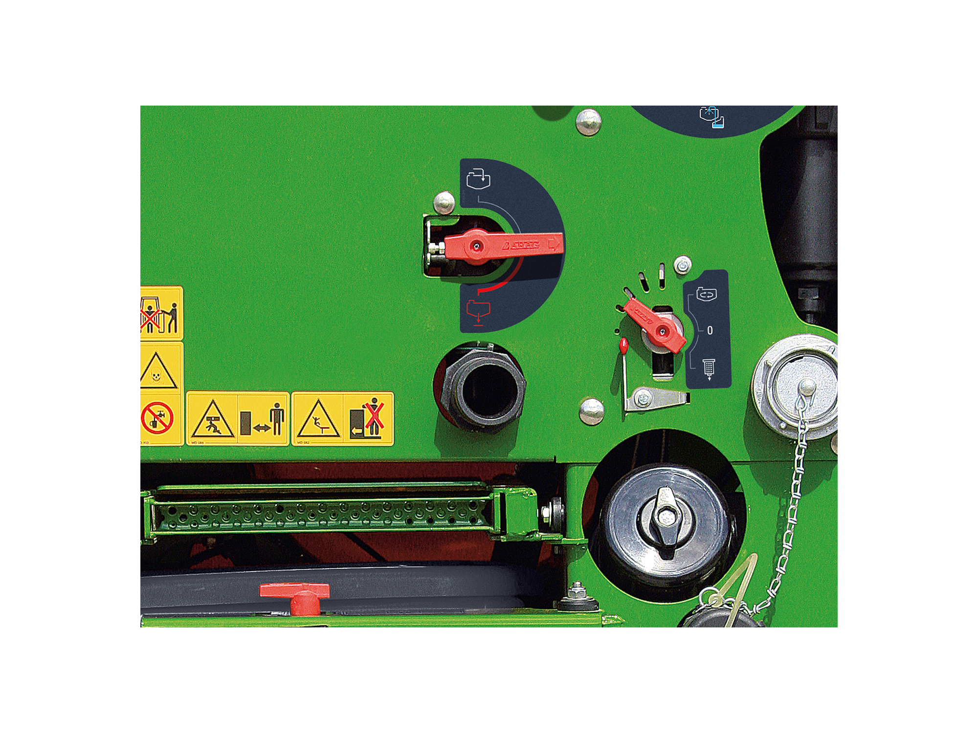 The sprayer can be filled using the suction hose via the 2" suction port. The liquid flow is routed in such a way that during the filling procedure there is always clean water available at the induction bowl.