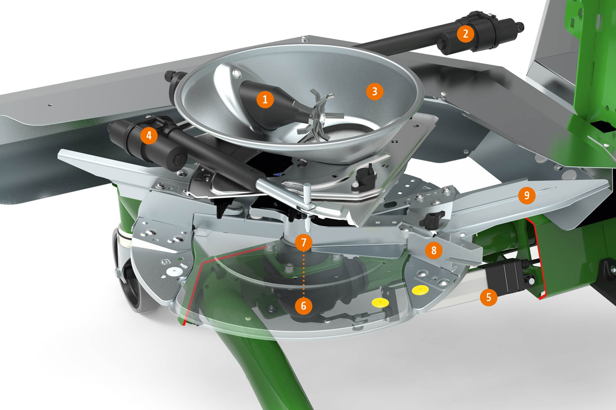 9) Paleta de dispersión normal larga para radios de dispersión elevados y solapamiento doble incluso con un ancho de trabajo de 36 m