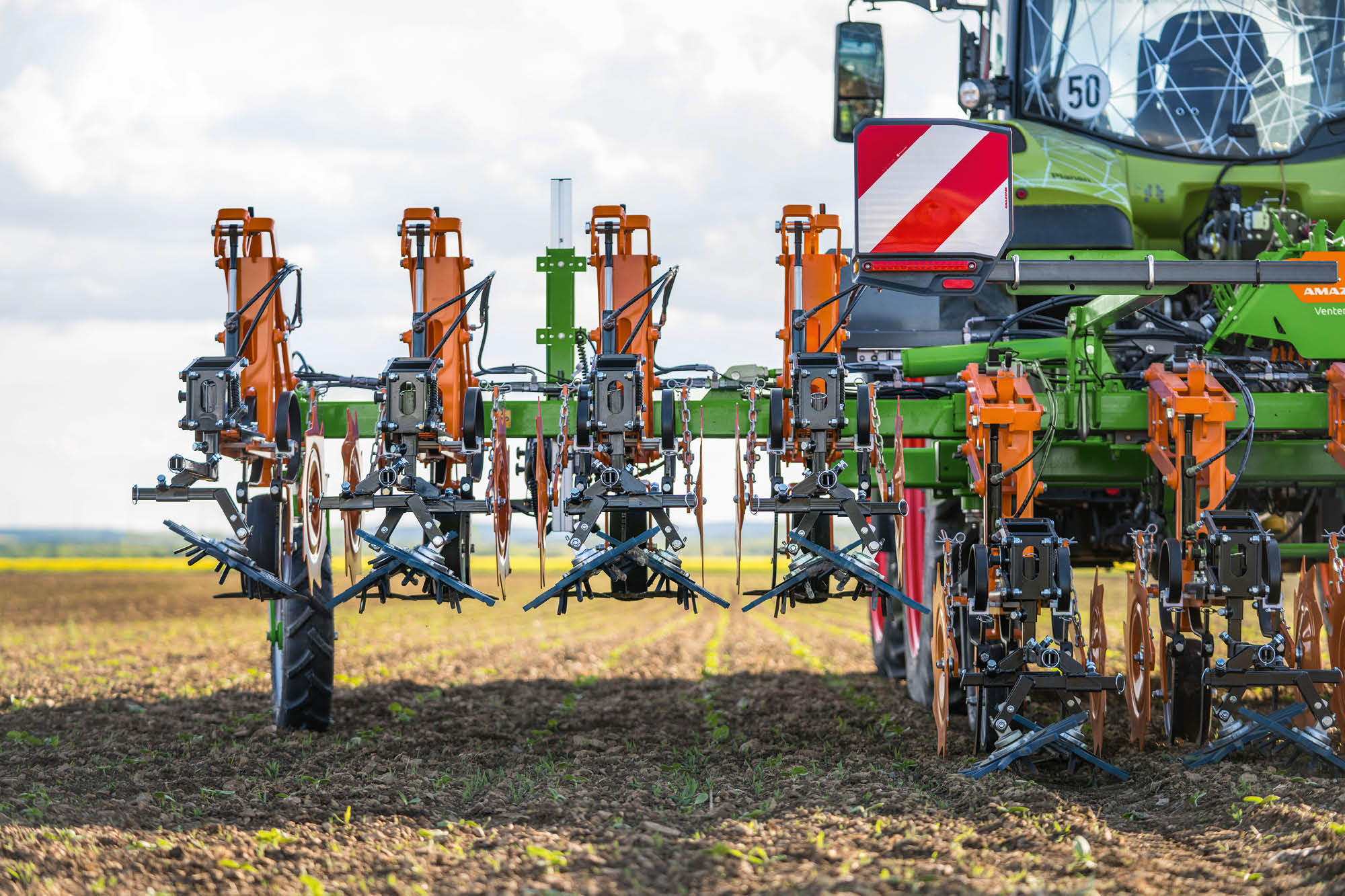 Gracias al uso del control de anchos parciales automático, los conjuntos de la escardadora pueden elevarse y bajarse hidráulicamente de forma individual. De este modo, en los campos cónicos, se puede desherbar en la cabecera en todas las hileras hasta la esquina sin dañar ningún cultivo.