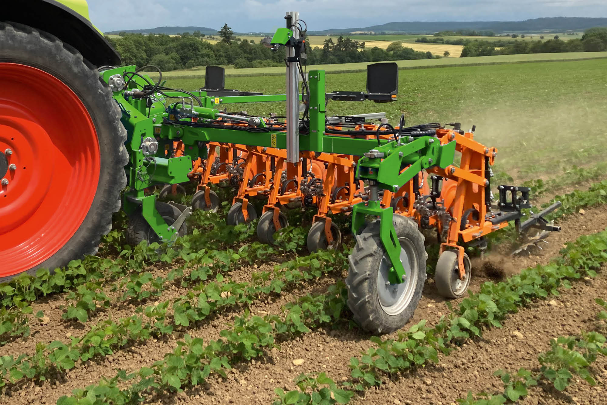 Gracias al uso del control de anchos parciales automático, los conjuntos de la escardadora pueden elevarse y bajarse hidráulicamente de forma individual. De este modo, en los campos cónicos, se puede desherbar en la cabecera en todas las hileras hasta la esquina sin dañar ningún cultivo.