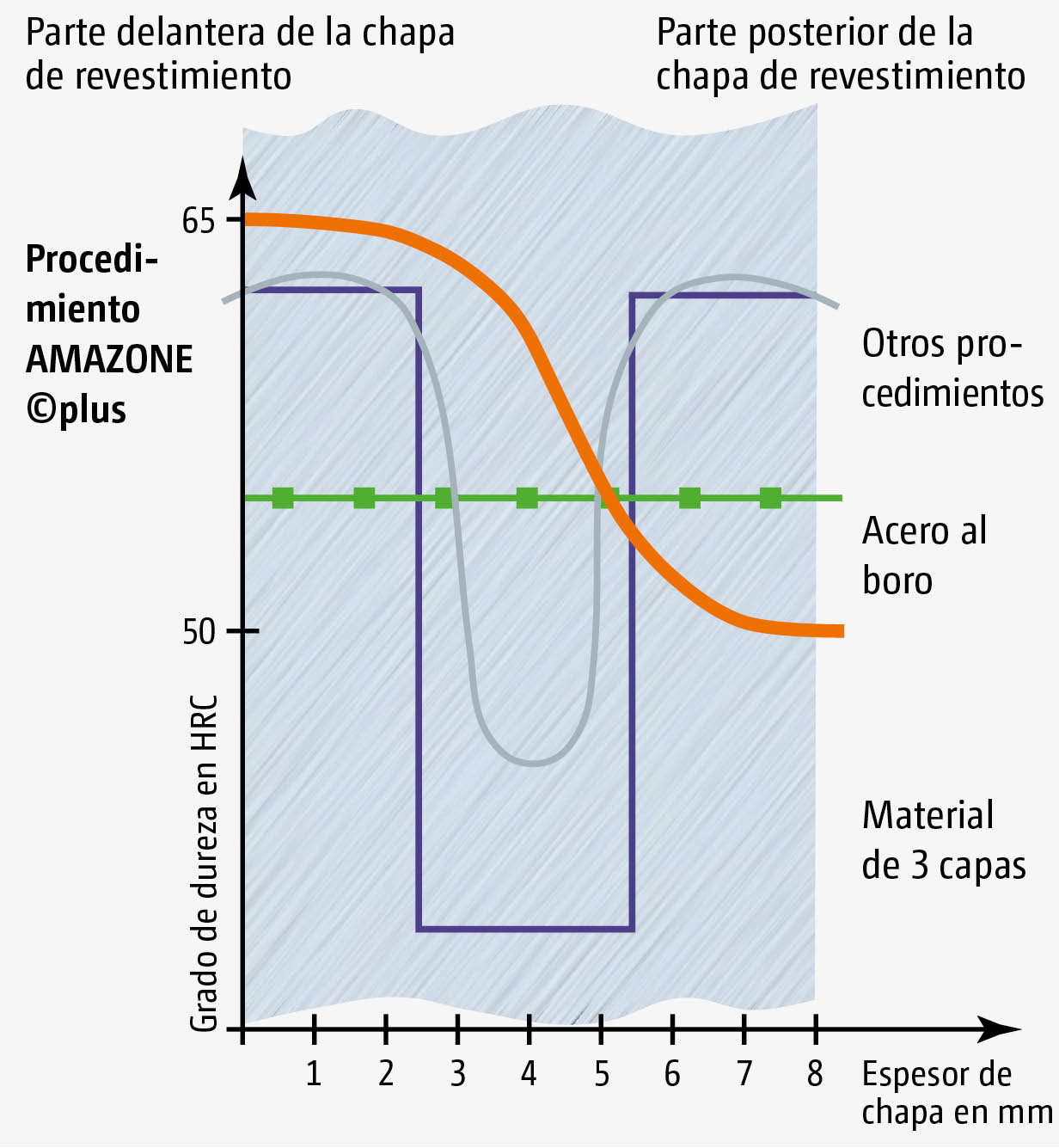 El carbono en su forma más pura como diamante es el material más duro que produce la tierra. Mediante la incorporación adicional de carbono, las piezas de desgaste ©plus se vuelven más duras y más resistentes. AMAZONE logra incrementar al máximo la dureza, por ejemplo, en la parte delantera de la chapa de revestimiento, empleando un proceso de endurecimiento exclusivo. Esto se traduce en una máxima resistencia al desgaste. La parte posterior permanece relativamente blanda a la par que resistente.
