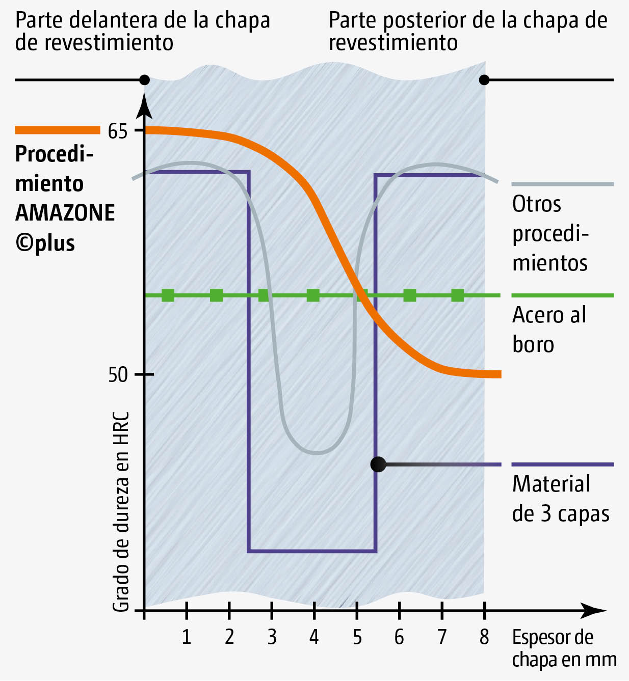 El carbono en su forma más pura como diamante es el material más duro que produce la tierra. Mediante la incorporación adicional de carbono, las piezas de desgaste ©plus se vuelven más duras y más resistentes. AMAZONE logra incrementar al máximo la dureza, por ejemplo, en la parte delantera de la chapa de revestimiento, empleando un proceso de endurecimiento exclusivo. Esto se traduce en una máxima resistencia al desgaste. La parte posterior permanece relativamente blanda a la par que resistente.