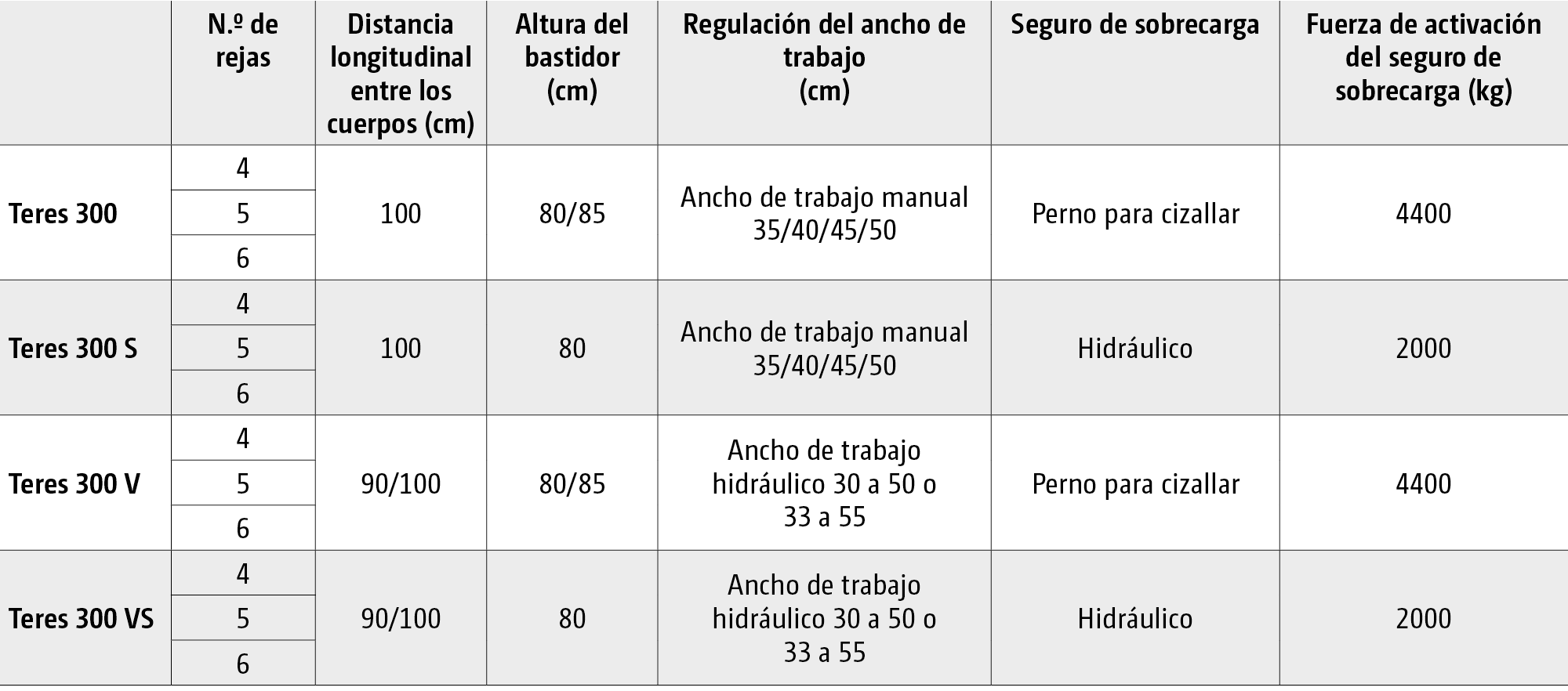 Resumen de los modelos de producto Teres 300: