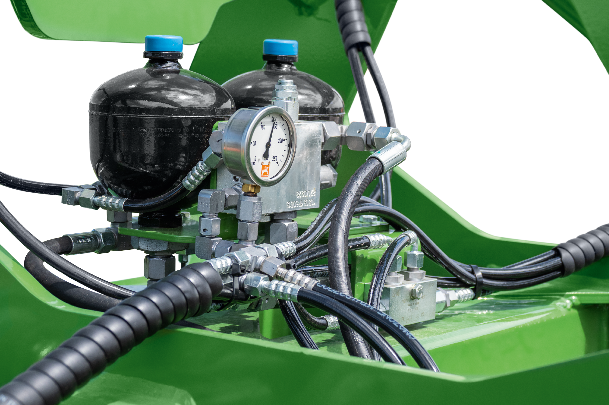 Cada bastidor lateral está equipado con 2 segmentos de herramientas, cada uno de 3 m de ancho, que pueden regularse individualmente en altura. La profundidad de trabajo de cada segmento puede ajustarse por separado. Las herramientas, pretensadas con muelles de compresión, se regulan mediante pasadores excéntricos. El sistema de muelles ajusta la relación de altura y de presión entre la herramienta principal y el herramienta de arrastre.