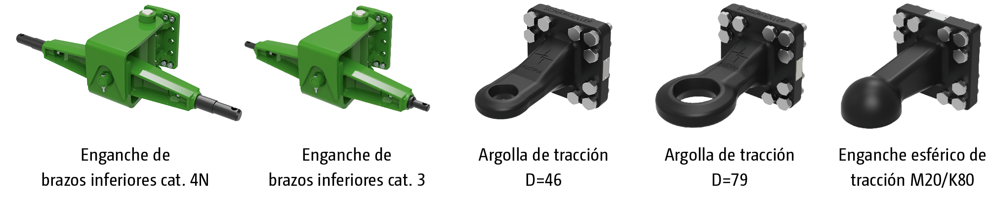 Para ello solo es necesario cambiar la posición de los pernos de acoplamiento. Esto permite seleccionar el enganche adecuado para cada tractor, ya sean enganches de brazos inferiores de cat. 3, 4N o K700, diferentes argollas de tracción o enganches esféricos de tracción K80.