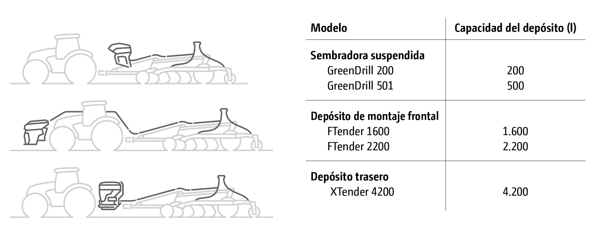 Para que pueda sembrar las semillas de los cultivos intermedios directamente o al tiempo que realiza el laboreo del suelo, AMAZONE ofrece las sembradoras suspendidas GreenDrill 200 y GreenDrill 501. Los depósitos de semillas de la GreenDrill tienen una capacidad de 200 l o 500 l y se puede acceder a ellos de forma segura a través de escalones.
