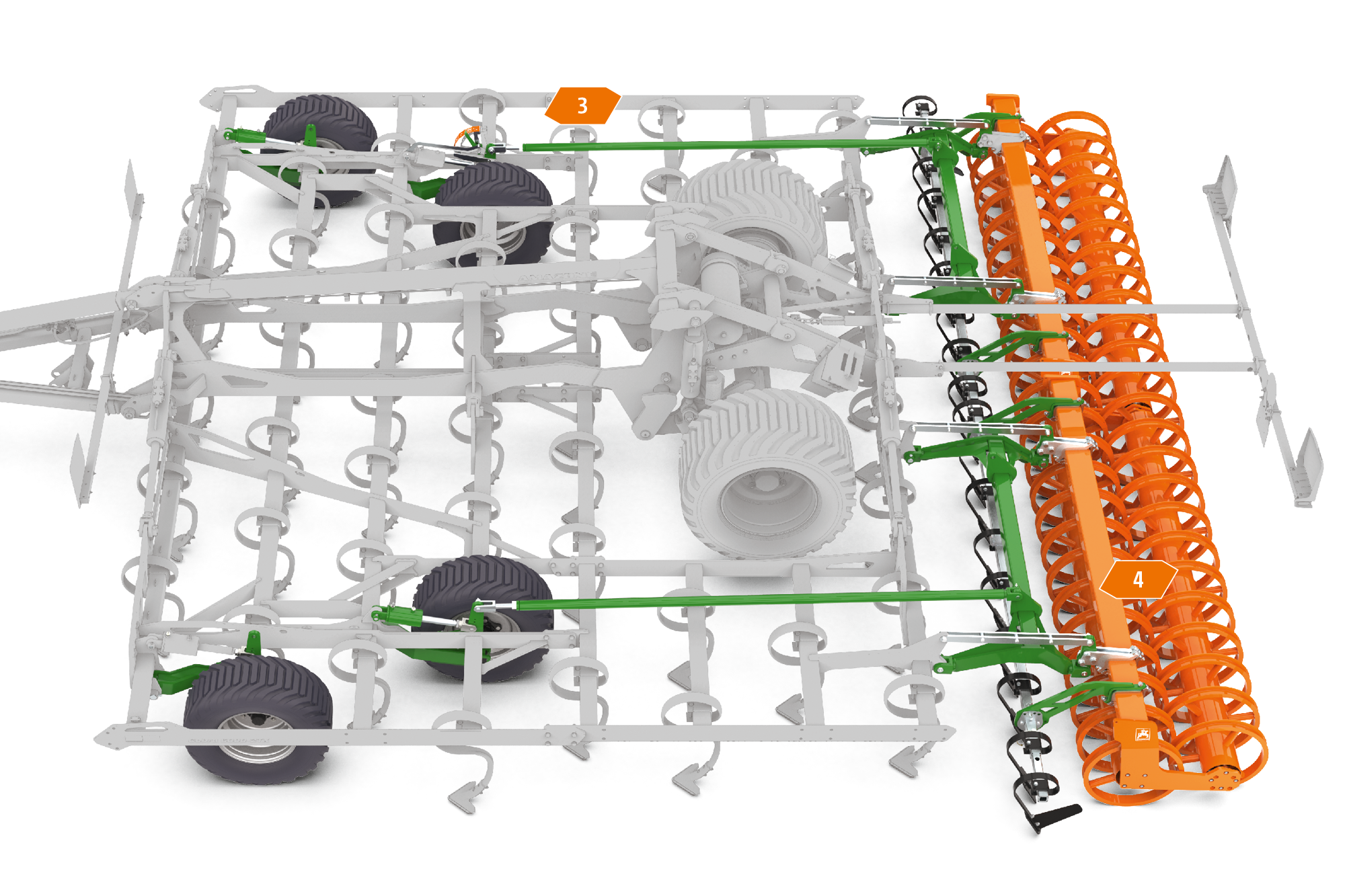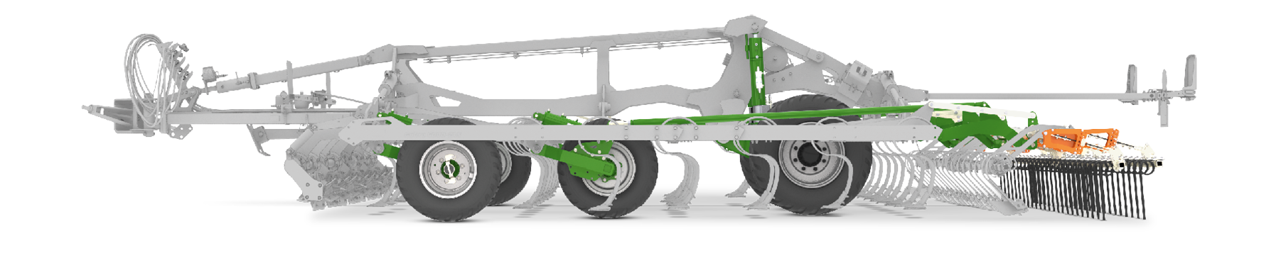 En caso de trabajar con rastra doble, el control de profundidad se lleva a cabo, además de con las ruedas de apoyo delanteras, a través de las ruedas de transporte. La particularidad aquí reside en que, detrás de las ruedas de transporte, hay montadas púas que vuelven a descompactar la huella del tren de rodaje. Al trabajar con rodillos de arrastre, el tren de rodaje está completamente elevado.