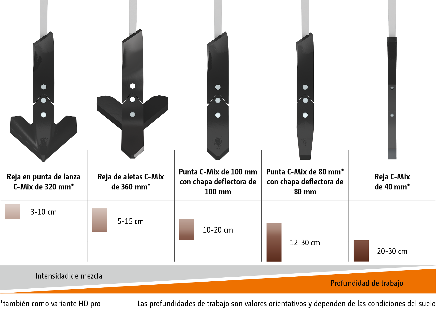 En el sistema de púas C-Mix 3 es posible elegir entre una amplia gama de rejas. Para el cultivo del rastrojo a poca profundidad se dispone de la reja de aletas C-Mix de 320 mm de anchura y la reja de aletas C-Mix de 360 mm de anchura. La reja C-Mix de 100 mm u 80 mm de anchura puede utilizarse para el cultivo básico del suelo y la reja C-Mix de 40 mm de anchura para la descompactación profunda. Esta variedad permite utilizar el cultivador de forma flexible para una amplia gama de aplicaciones. Las variantes HD pro disponibles opcionalmente permiten multiplicar por ocho la vida útil de las diferentes rejas.