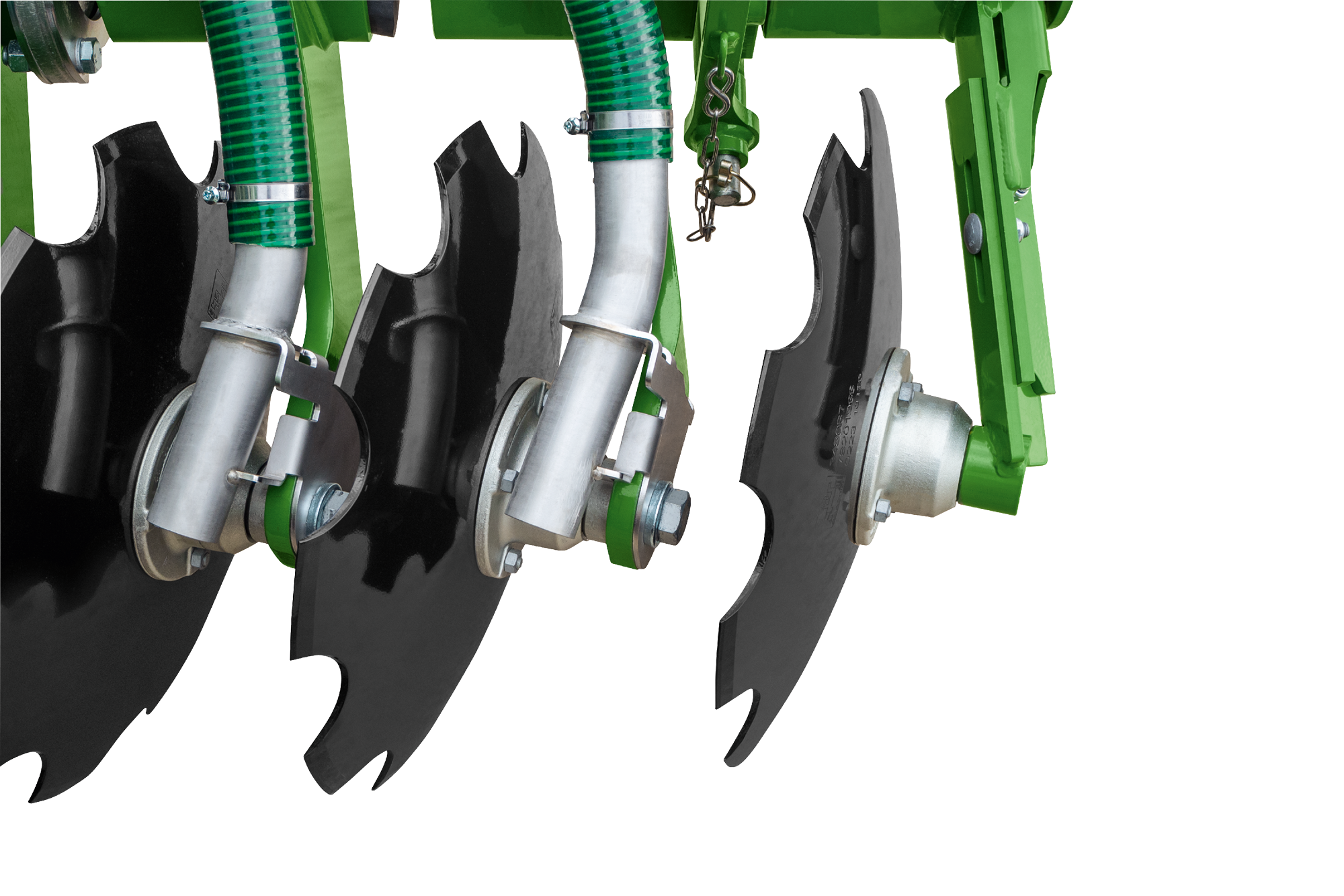 La Catros pro puede combinarse con el esparcidor de abono semilíquido SynCult DosiMat DMX de la marca Vogelsang. Este se caracteriza por altas dosis de aplicación de hasta 10 000 l/min y una elevada precisión de distribución constante independientemente del caudal. En el bastidor adaptador van montados de manera fija el esparcidor y las tuberías del sistema del abono semilíquido hasta la primera fila de discos de la Catros. AMAZONE instala el distribuidor de abono semilíquido y el entubado directamente de fábrica.