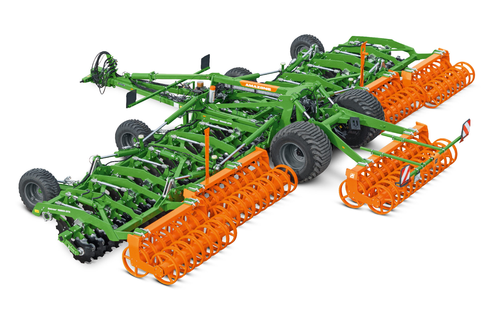 La nueva Catros+ 12003-2TX convence con el tren de rodaje TX de eficacia probada y un ancho de trabajo de 12 m. Además de los conocidos discos con un diámetro de 510 mm, ahora también está disponible el disco X Cutter con un diámetro de 480 mm, perfecto para trabajos intensivos en el laboreo del suelo a poco profundidad. Para su uso en el «Controlled Traffic Farming», hay disponible opcionalmente un cuerpo de discos mayor con un ancho de trabajo de 12,25 m. Otra novedad en la gama es el rodillo de perfil en U doble que garantiza una recompactación óptima. Gracias al sistema ComfortClick opcional, el cambio entre la posición de trabajo y la posición de transporte se realiza de forma rápida y cómoda directamente desde la cabina del tractor.