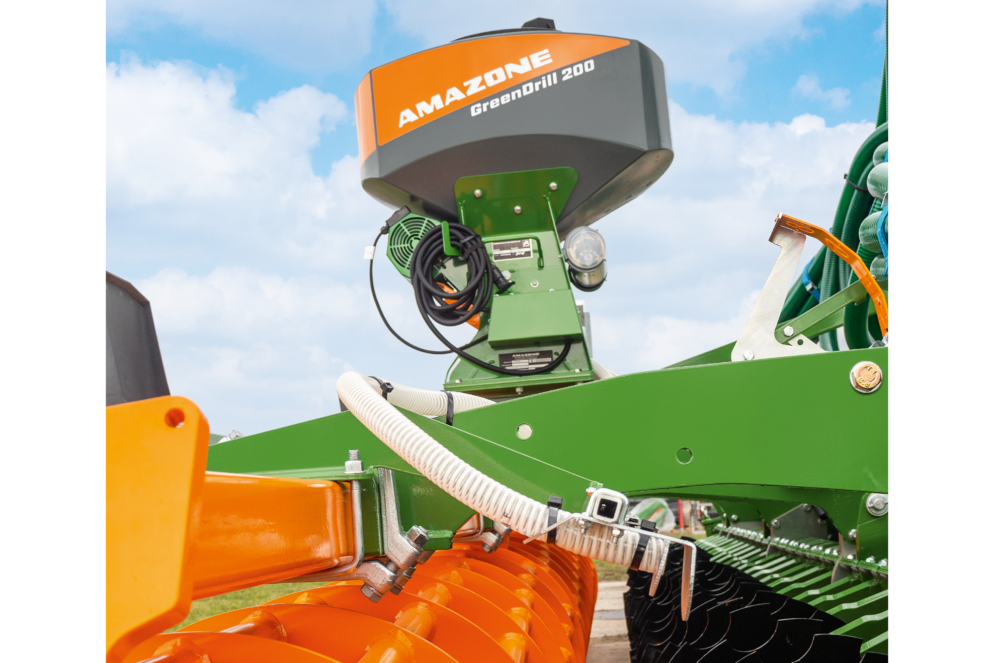 Para que pueda sembrar las semillas de los cultivos intermedios directamente o junto con la máquina de laboreo del suelo, AMAZONE ofrece el depósito de montaje posterior GreenDrill 200 para los modelos acoplados y el GreenDrill 501 para los modelos remolcados. Los depósitos de semillas de la GreenDrill tienen una capacidad de 200 l o 500 l y se puede acceder a ellos de forma segura a través de escalones.