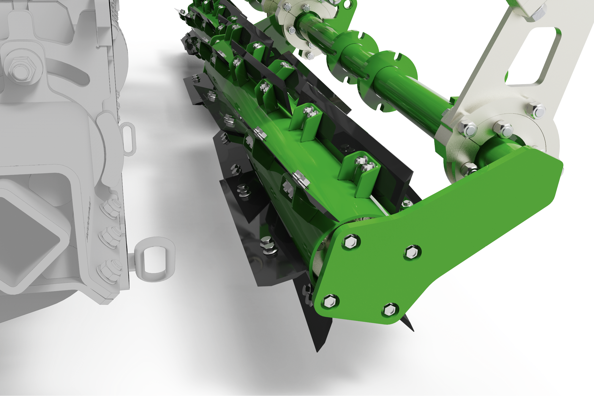 Durante el trabajo, el ajuste del rodillo hasta la posición de trabajo se realiza desde la cabina. Gracias a la distribución en diferentes segmentos, el rodillo puede copiar perfectamente el contorno del suelo incluso en terrenos irregulares y triturar los restos de cosecha con seguridad en todo el ancho de trabajo.