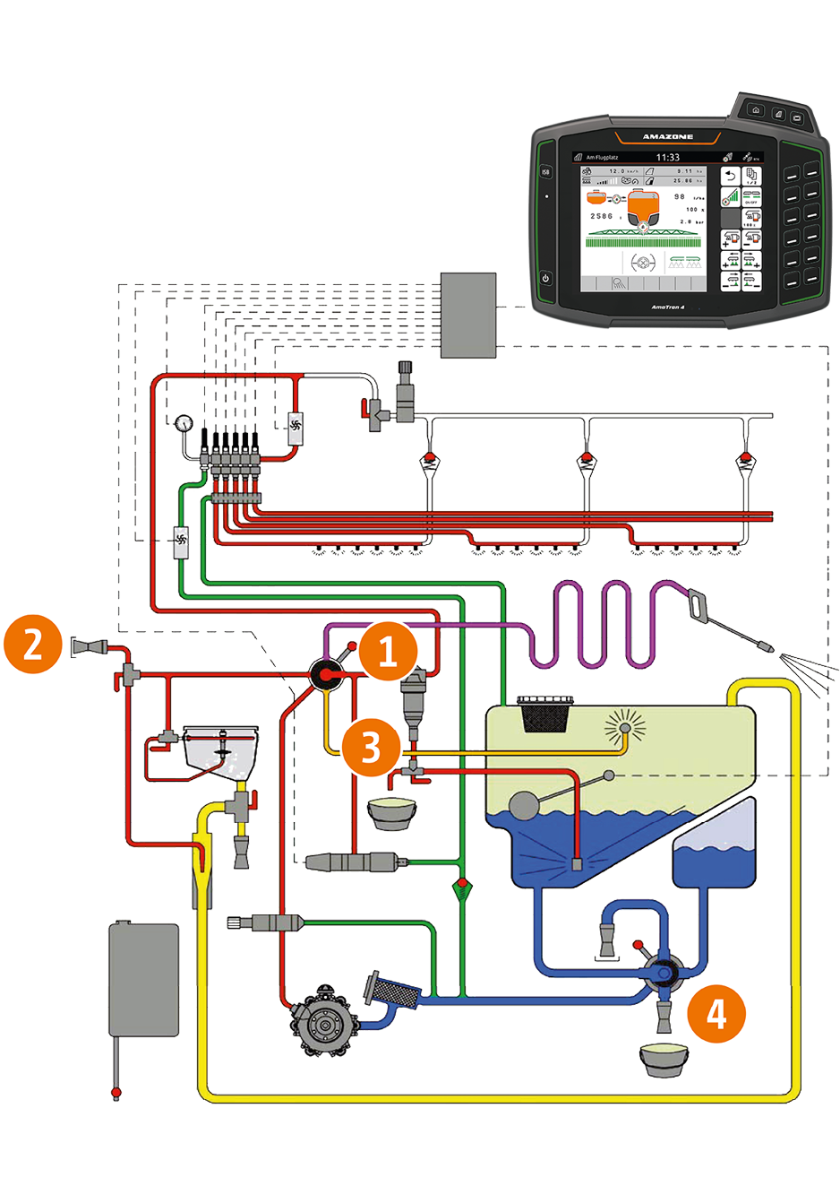 «Las tres boquillas agitadoras adicionales garantizan un elevado efecto de agitación y permiten incorporar medios difícilmente solubles. Práctico: El enjuague por cartuchos limpia incluso la compuerta de pulverización con la tapa cerrada.»