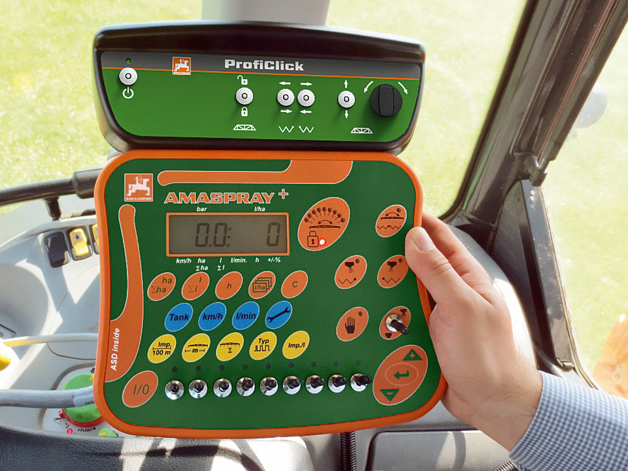 En cultivos especiales y en el tratamiento en nidos es frecuente que se activen y desactiven anchos parciales individuales en el centro de la barra. AmaClick es una unidad de mando ergonómica que se puede usar tanto en combinación con el joystick multifuncional AmaPilot+ como sola, mediante un terminal ISOBUS.
