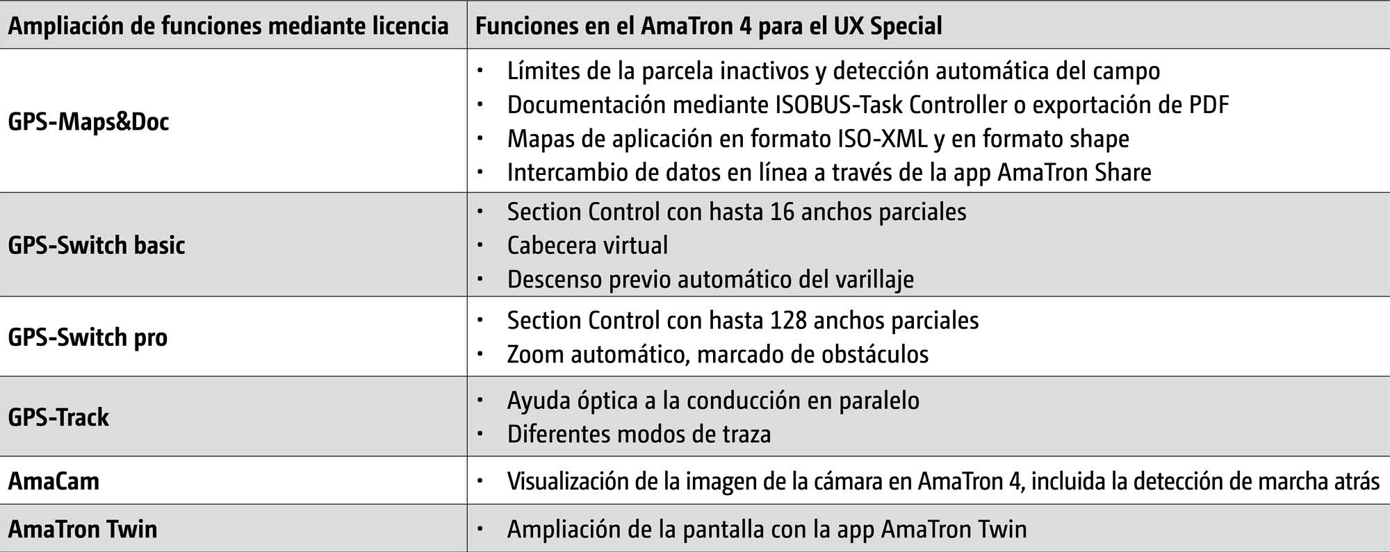 - Control automático de anchos parciales con hasta 128 anchos parciales, especialmente para la técnica de protección fitosanitaria con control de boquillas individuales