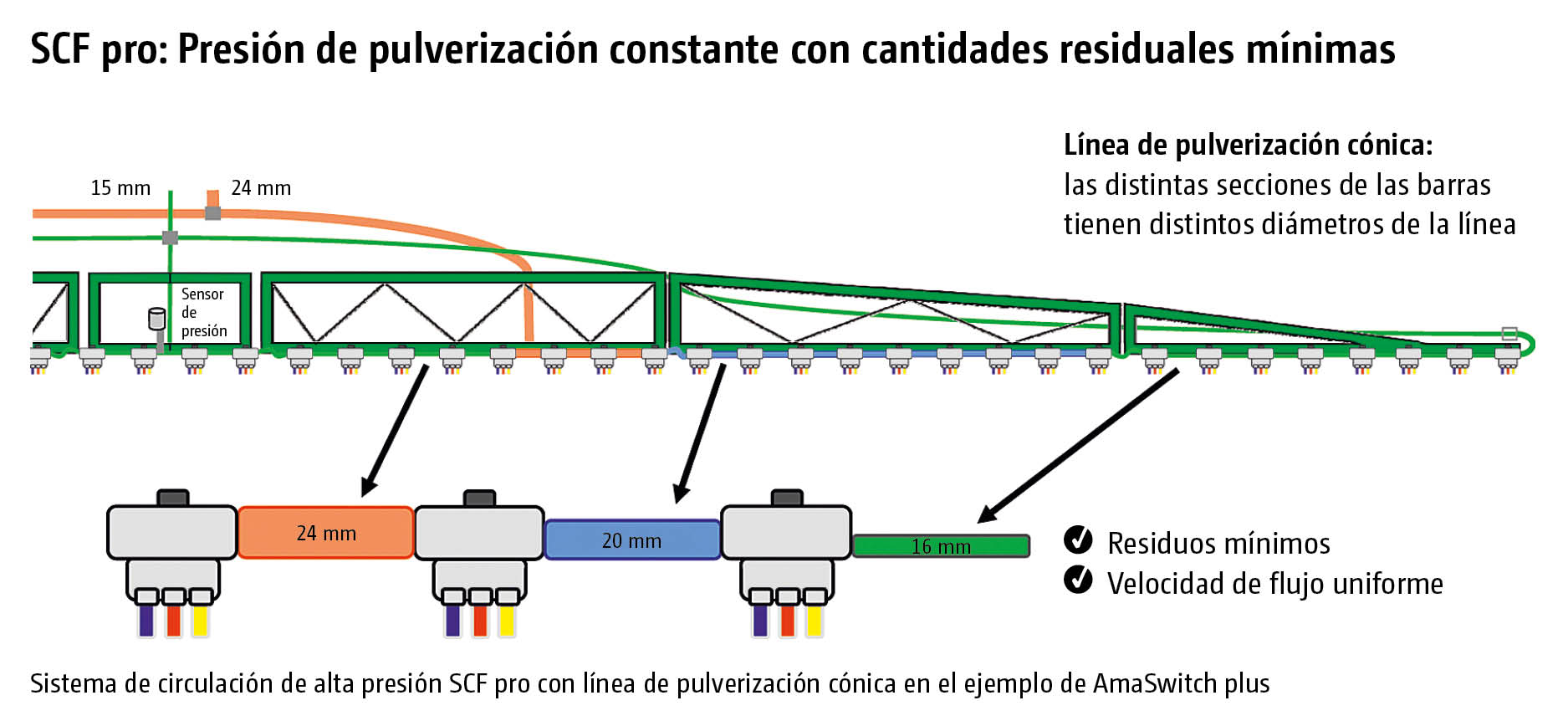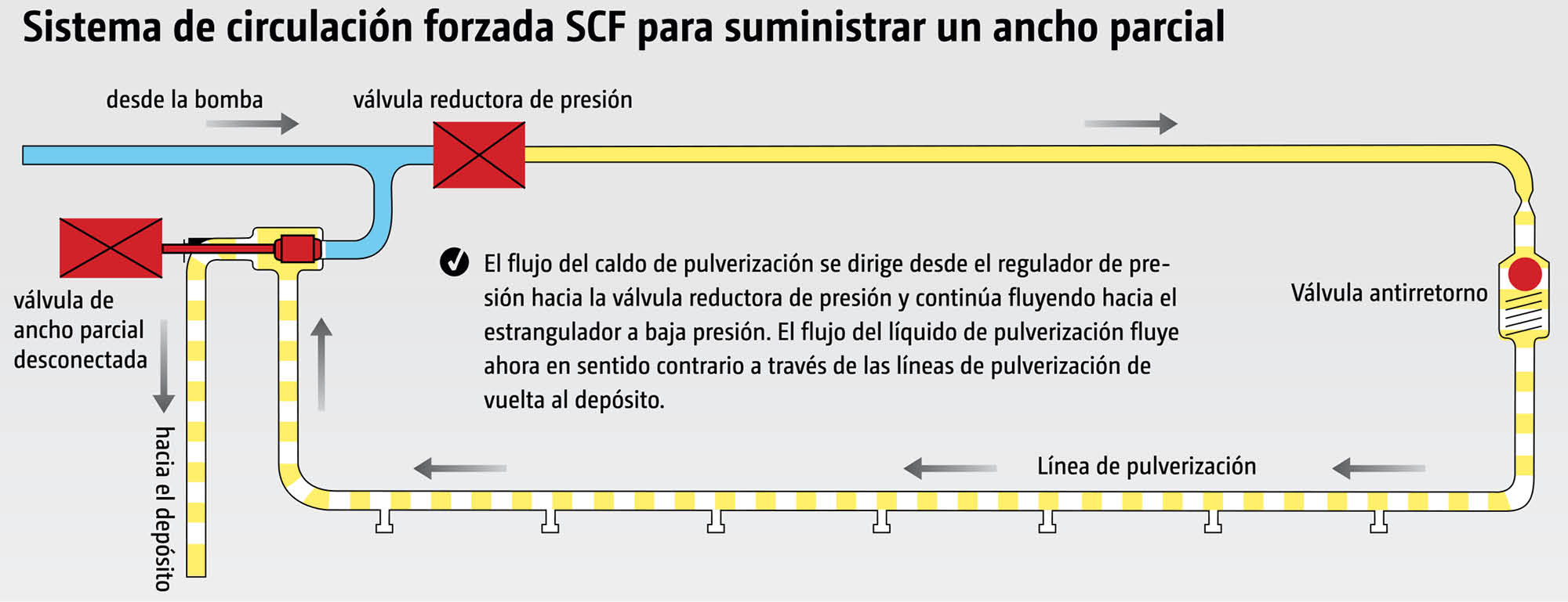 El sistema de circulación forzada SCF de AMAZONE garantiza una circulación segura en todo el sistema. Al iniciarse el trabajo, el sistema de tuberías, incluyendo la línea de pulverización, se inunda primeramente con la solución de sustancias activas bajo presión y en la dirección opuesta. A consecuencia de ello, los conductos de pulverización están siempre llenos e inmediatamente listos para su uso en todo el ancho de trabajo. Sin tiempos de espera en la cabecera.