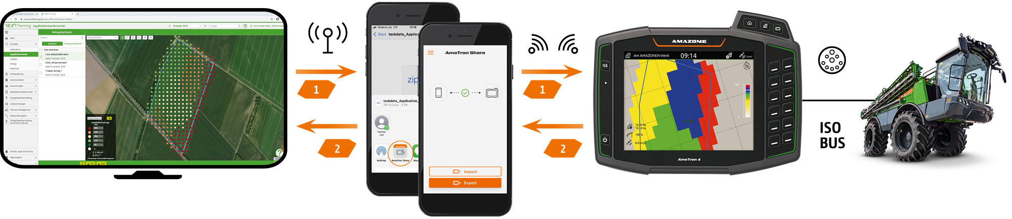Todos los datos pueden transferirse cómodamente en línea mediante la app AmaTron Share, que está conectada al AmaTron 4 a través de WLAN. La aplicación puede utilizarse, por ejemplo, simplemente para enviar mapas de aplicación desde la oficina al AmaTron 4 y procesarlos. También es posible enviar los datos del pedido a los clientes o de vuelta a la oficina como documentación PDF a través de la nube, el correo electrónico o servicios de mensajería como WhatsApp una vez finalizado el trabajo. Se trata de una cómoda gestión de datos.
