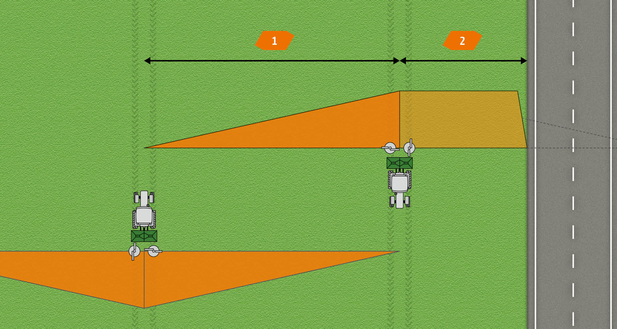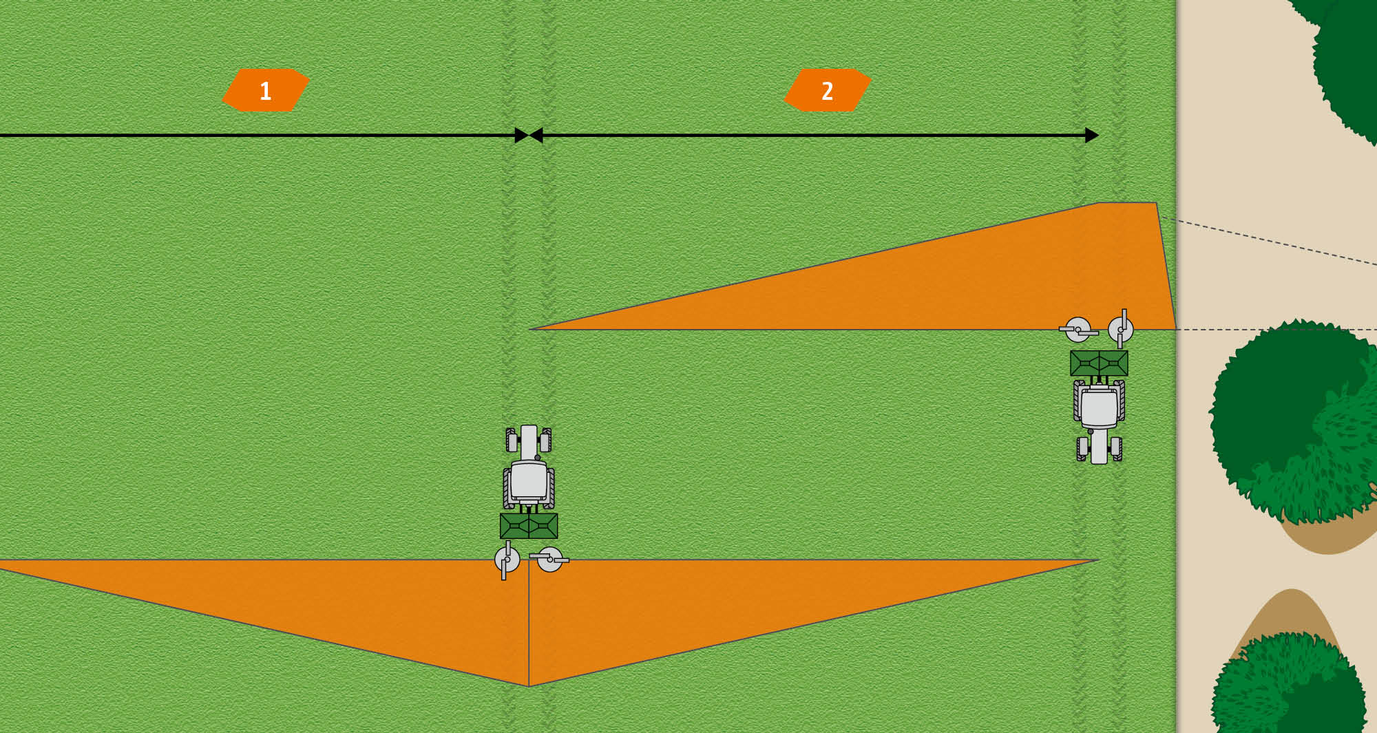 Si la primera calle se encuentra al borde del campo, la dispersión en límite (ajuste orientado al medioambiente) se efectúa mediante la desactivación de medio lado del abanico de dispersión. No se lanza abono más allá del borde del campo y el interior del campo sigue abonado de modo óptimo.
