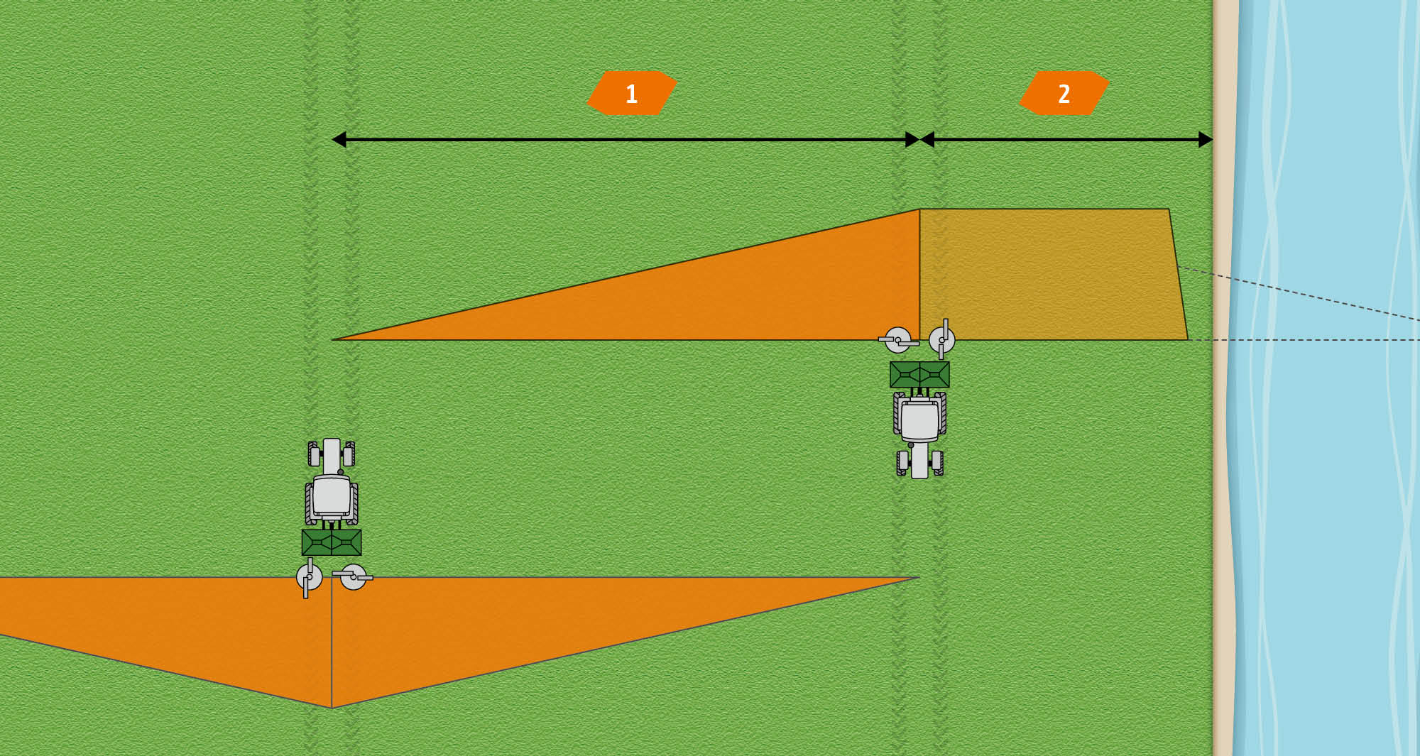 Si el borde de la parcela se encuentra directamente junto a aguas superficiales, según la normativa en materia de abonos deberá mantenerse una distancia definida a dichas aguas durante el proceso de fertilización. Para ello, el radio de dispersión se reduce aún más en combinación con la corredera de caudal.