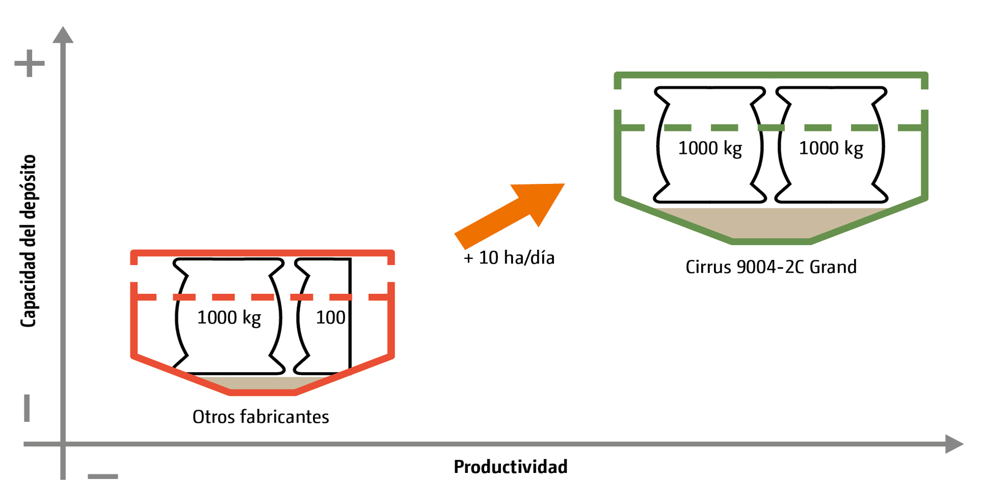 La Cirrus 9004-2C Grand está equipada de serie con un depósito de doble cámara de 60:40. El volumen total del depósito optimizado para sacos grandes y con una sobrecapacidad suficiente es de 5750 l. Gracias a esta sobrecapacidad, puede llenarse cuando convenga. El depósito puede acoger siempre el contenido completo de un saco grande, incluso en caso de contar con cantidades residuales mayores. Esto simplifica la logística de las semillas, puesto que el momento del llenado puede ser más flexible.