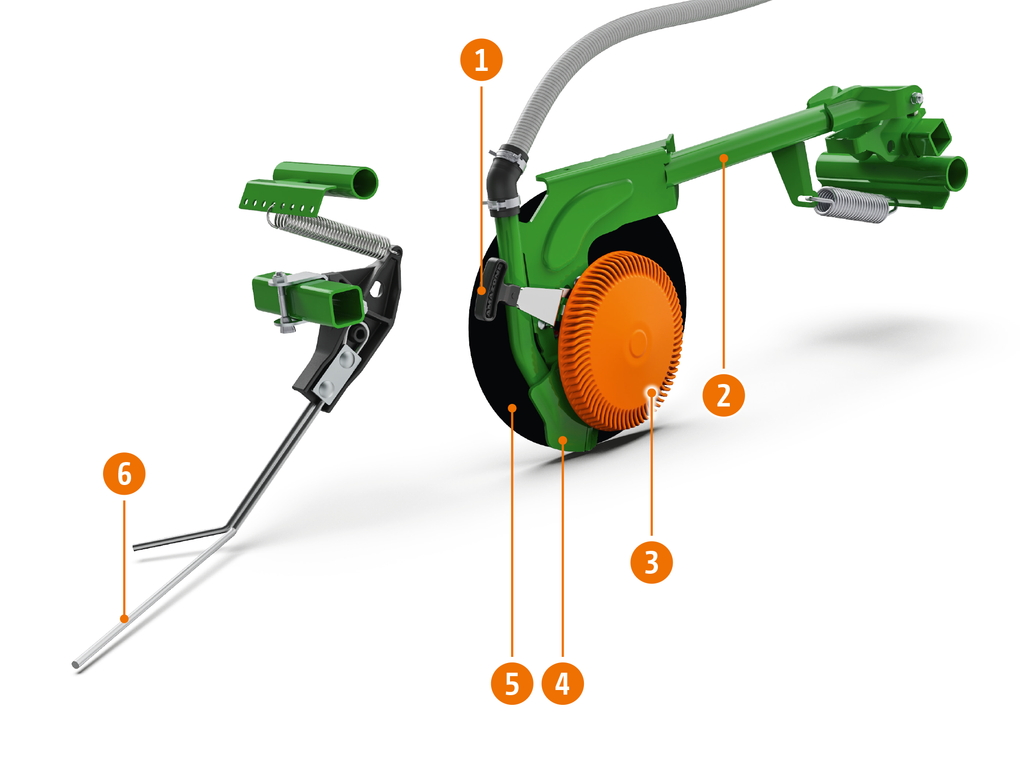3. Disco de guiado en profundidad Control 10 o rodillo de guiado en profundidad Control 25 para un control de profundidad uniforme. El elemento de guiado en profundidad limpia activamente el disco de siembra durante el uso.