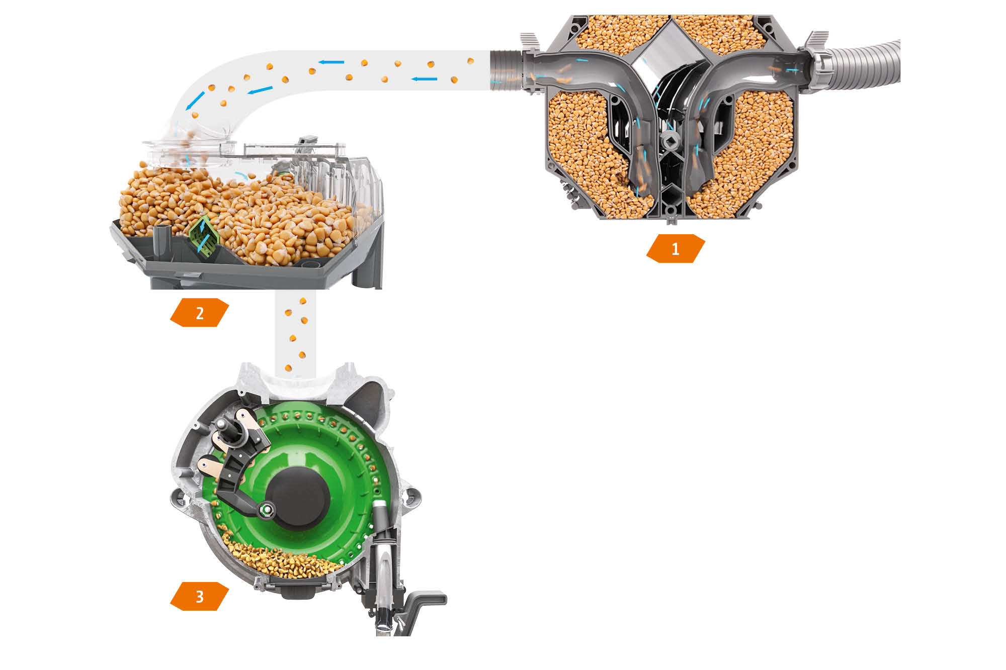 En la cámara a presión de separación, los granos se presionan por efecto de la sobrepresión contra los orificios en relieve del disco de separación giratorio y se transportan por él. Durante la rotación posterior, los granos presionados pasan por 3 raspadores encargados de garantizar el raspado y, con ello, la separación fiable de los granos en el orificio. De este modo se evitan con eficacia las aplicaciones dobles. Para descargar al conductor, el ajuste de los raspadores tiene lugar de forma automática mediante SmartControl.