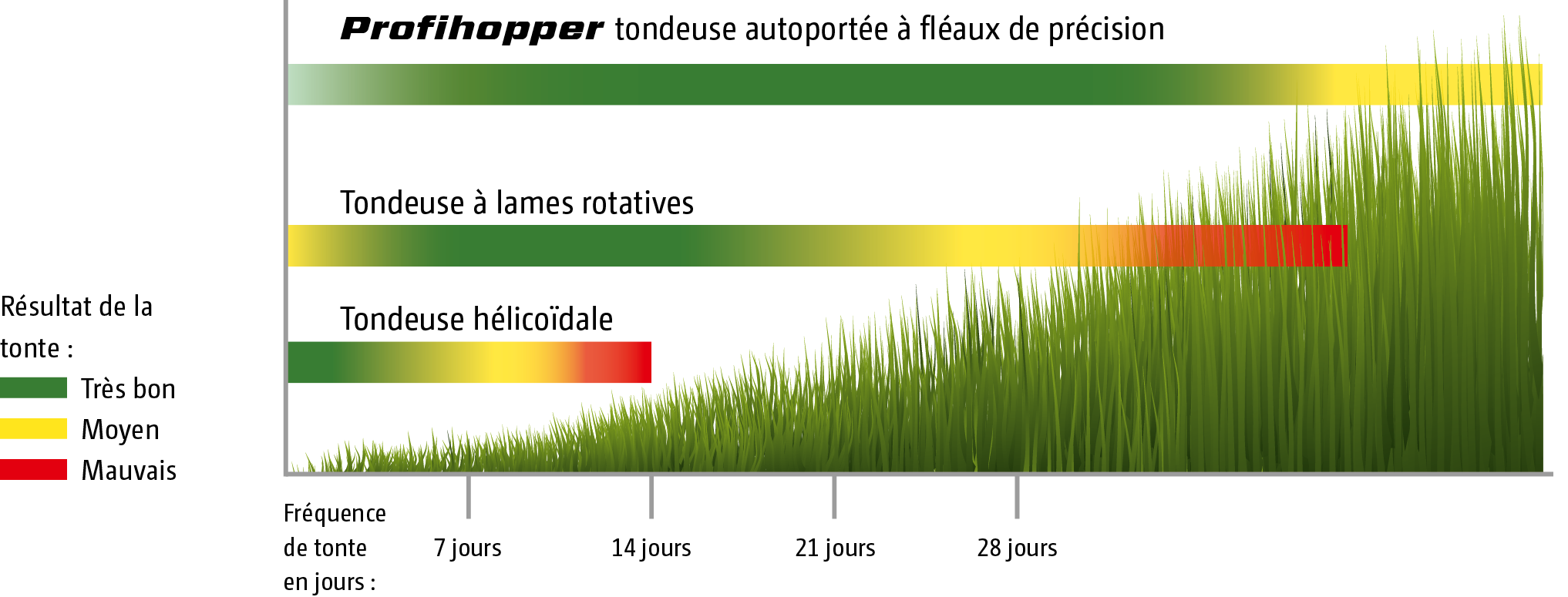 Comparée aux tondeuses rotatives et hélicoïdales, le Profihopper qui est une tondeuse à fléaux de précision, travaille de manière très fiable, même avec des hauteurs d’herbe nettement plus élevées. Le Profihopper offre un excellent résultat de tonte, aussi bien en herbe courte qu’en herbe haute – et dans presque toutes les conditions météorologiques et de végétation.