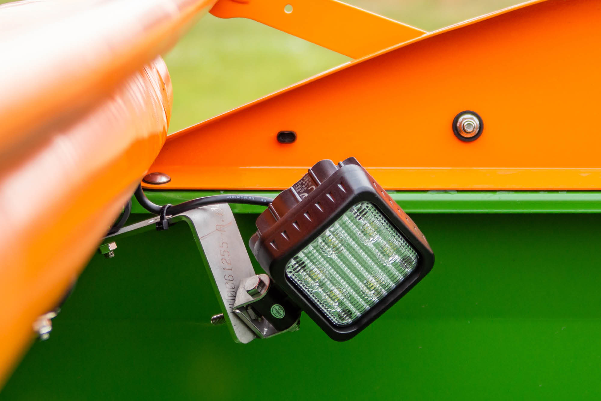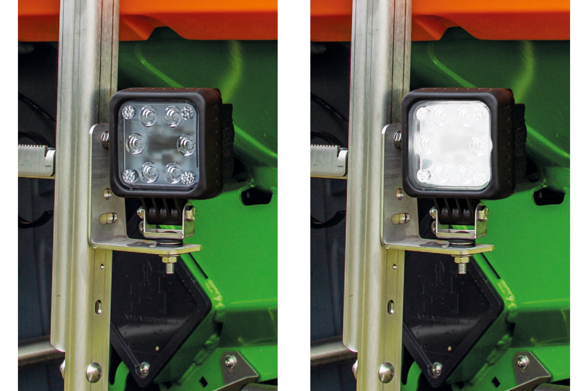 Des phares à LED sont montés dans la trémie, au-dessus des disques d’épandage et sur les côtés de l’épandeur. Ainsi même de nuit, l’utilisateur visualise le niveau de remplissage de la trémie et dispose d’une lumière suffisante pour changer les disques d’épandage et pour régler les éléments télescopiques sur les aubes d’épandage.