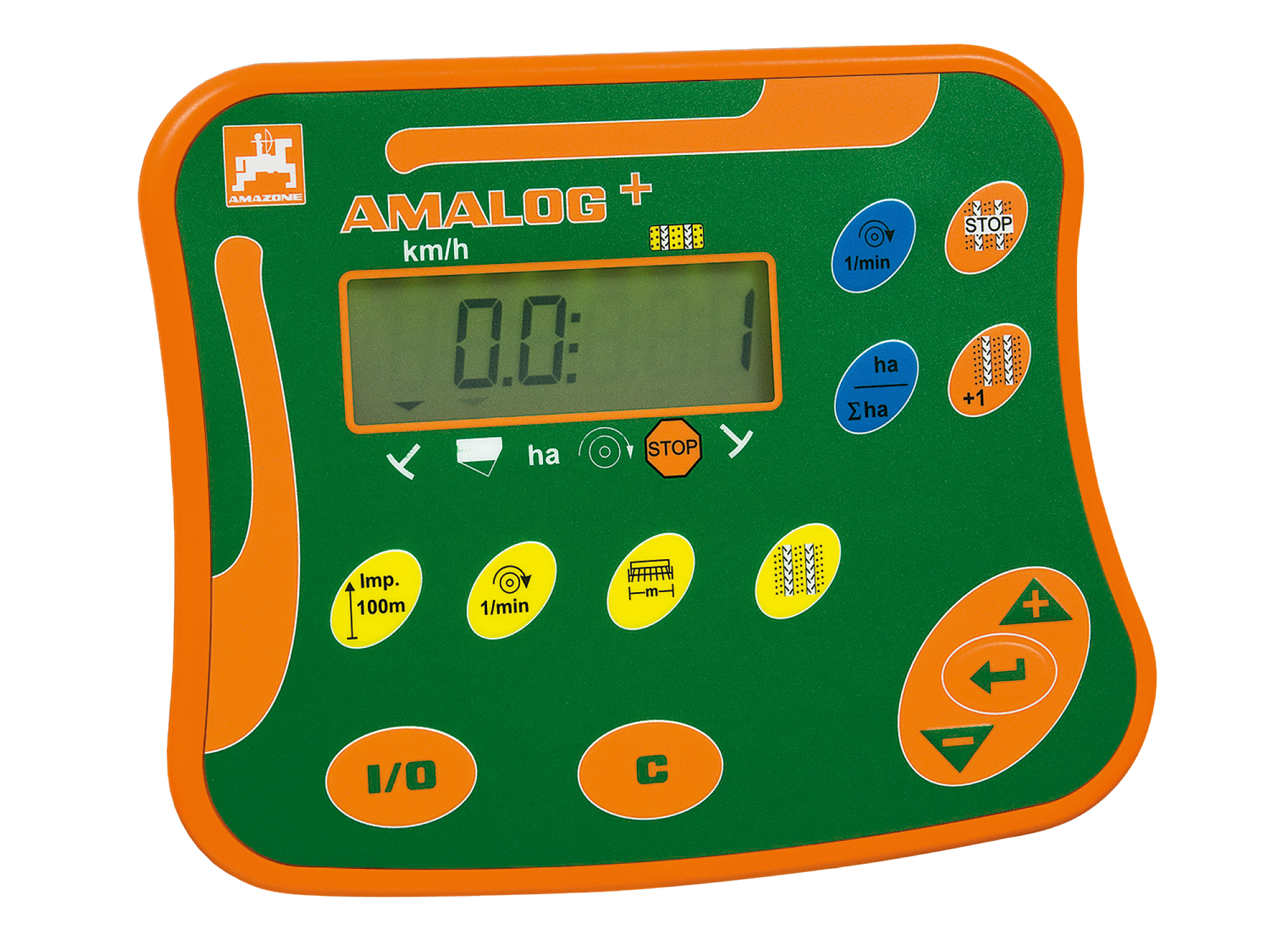 Le terminal AmaLog+ est spécialement conçu pour le pilotage des semoirs AMAZONE. Le terminal est confortable à utiliser et alimenté par une prise de courant 3 pôles.