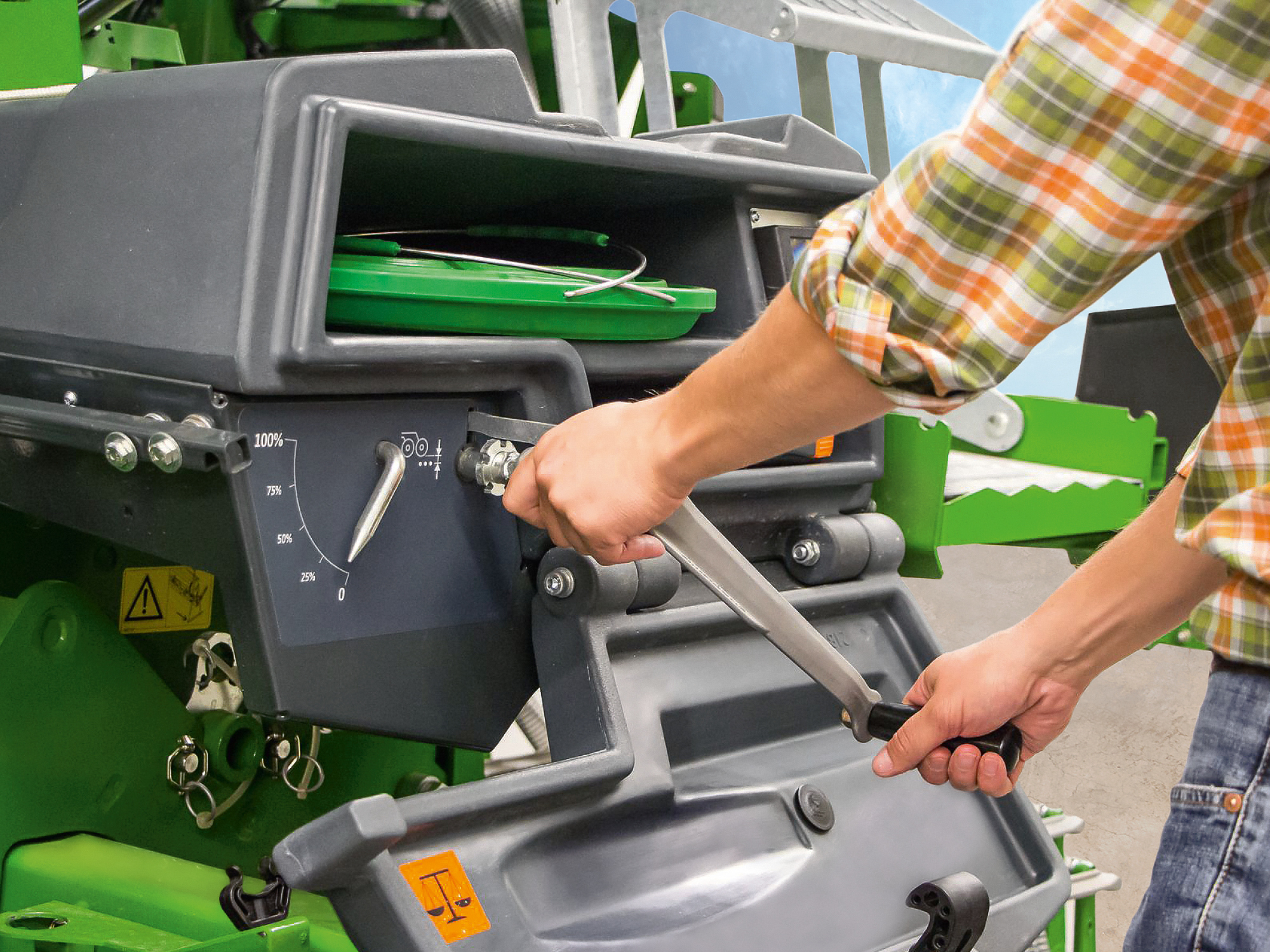 La pression des FlexiDoigts s’obtient mécaniquement par tension des ressorts et de façon centralisée. Avec le réglage hydraulique, une valeur minimale et une valeur maximale sont définies au préalable en insérant un axe. Il est ainsi possible d’adapter rapidement, facilement et simultanément la pression du Flexidoigts et de l’élément semeur avec un seul distributeur durant le travail et en fonction des hétérogénéités des sols.