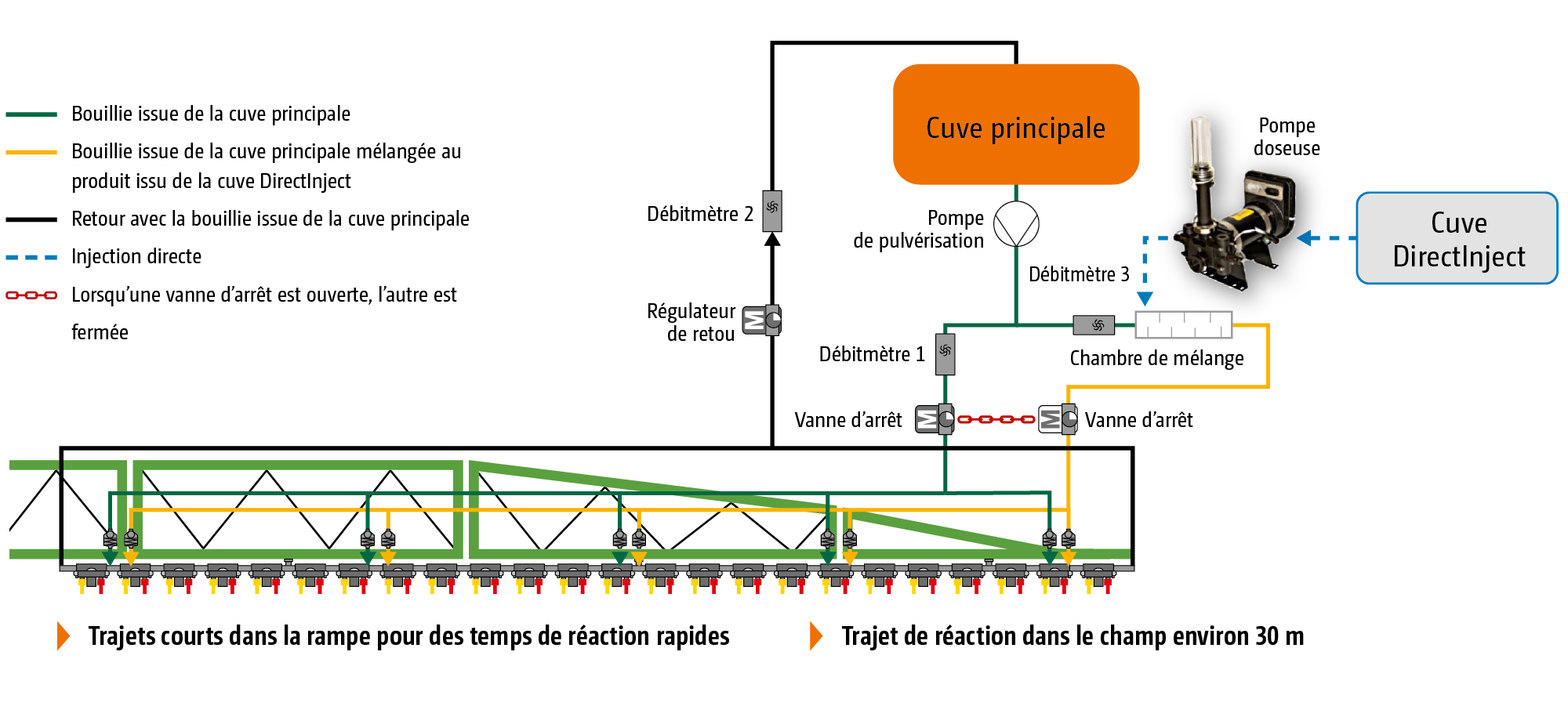 Si le conducteur du Pantera constate par exemple qu’il faut agir sur certaines adventices dans une partie de la parcelle, il peut activer DirectInject depuis la cabine en appuyant sur un bouton. Le produit supplémentaire issu de la cuve DirectInject est injecté et appliqué en plus de la bouillie issue de la cuve à bouillie. Le temps de réaction est optimisé par rapport aux systèmes conventionnels grâce au système à deux conduites. Par rapport à un circuit classique, on a une deuxième conduite d'alimentation de la rampe contenant de la bouillie issue de la cuve principale pré-mélangée avec le produit issu de la cuve DirektInject. En activant l’injection directe, le mélange est injecté en plusieurs points d’alimentation dans la rampe vers les porte-jets et les buses. Les temps de réaction sont ainsi minimes. A cet effet, la vanne pour la bouillie provenant de la cuve à bouillie et la vanne pour la deuxième conduite de pulvérisation avec le produit DirectInject prémélangé sont commutées alternativement, de sorte que la bouillie n'est prélevée que sur une seule conduite à la fois.