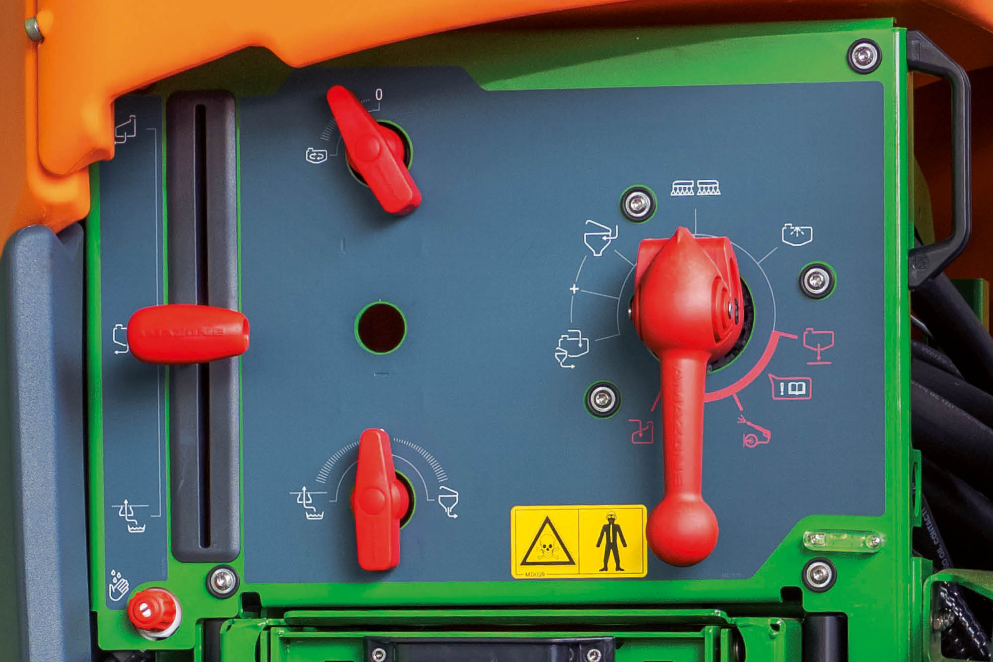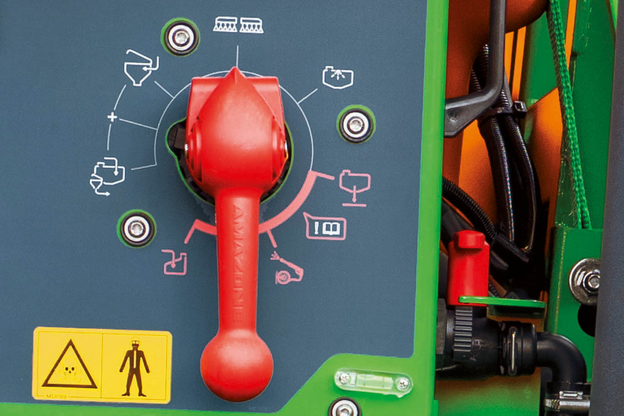 L’UF 02 est équipé d’une vanne de refoulement 7 voies. Contrairement aux vannes de refoulement classiques, celles de conception AMAZONE sont composées de soupapes à siège. En tirant le levier vers soi, le clapet correspondant se ferme ; on tourne alors le levier vers la nouvelle fonction souhaitée puis on réenclenche le levier et donc la fonction en le poussant.