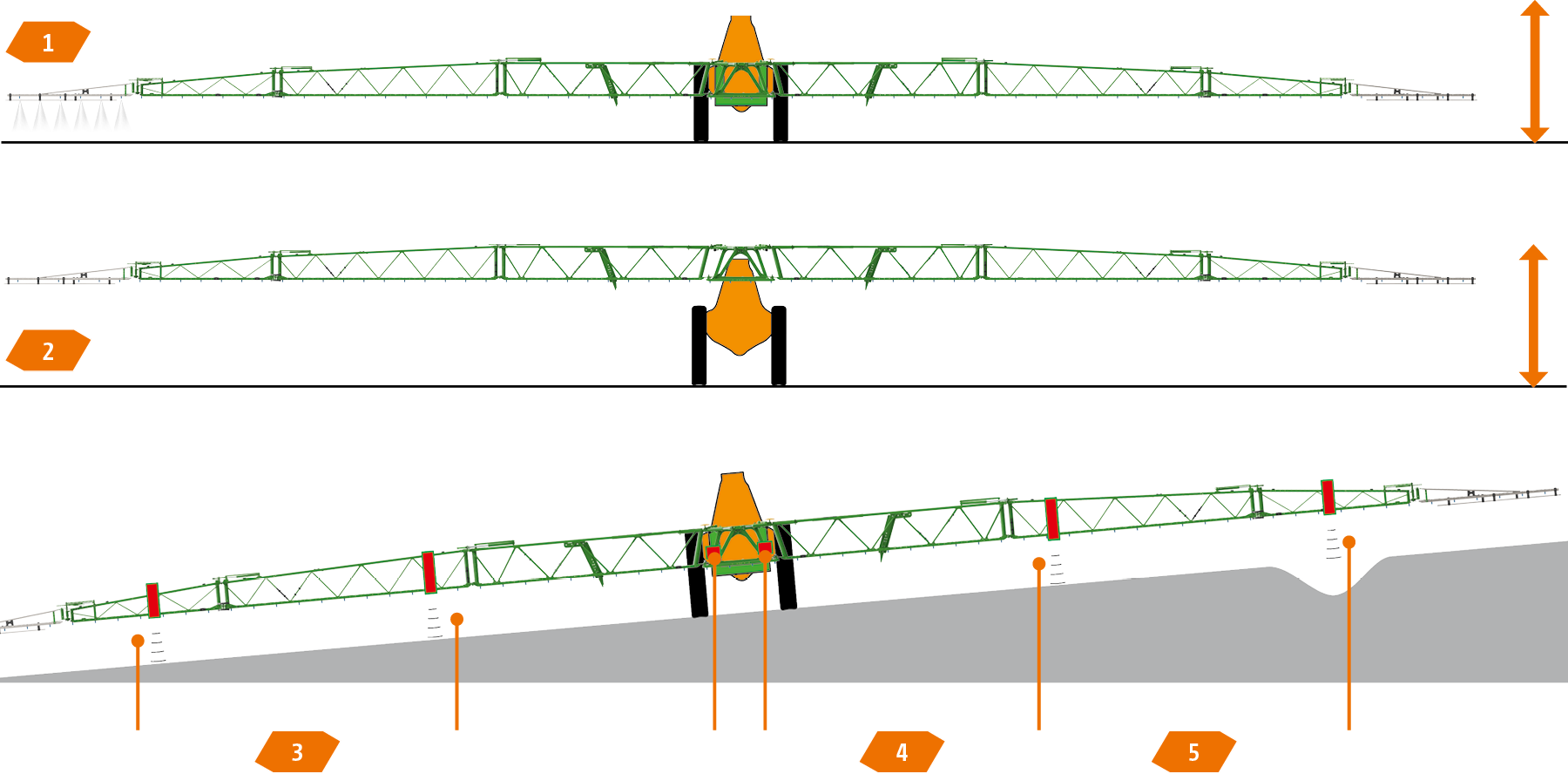 « En tout six capteurs à ultrasons assurent un guidage en hauteur du parallélogramme, l’adaptation et la correction au dévers ainsi que la commande de la géométrie variable de rampe (positive et négative). En terrain vallonné, c'est un véritable atout, surtout lorsqu’il s’agit d’être en mesure de pulvériser plus rapidement à une hauteur plus faible par rapport à la surface cible. »("profi" - « Test Amazone UX 4201 Super » · 02/2020)