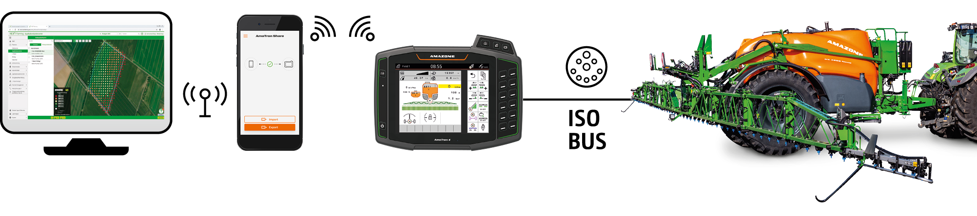 L'application AmaTron Share, associée à l’AmaTron 4 par WIFI, permet d’échanger facilement en ligne toutes les données. Ainsi, l'application facilite par exemple l'envoi et le traitement de cartes de modulation depuis votre ordinateur vers l'AmaTron 4. De même après le travail, les données des tâches réalisées sont envoyées sous forme de documentation PDF via un cloud, par mail ou par messagerie, telle que WhatsApp, aux clients ou au bureau. La gestion des données est très conviviale.