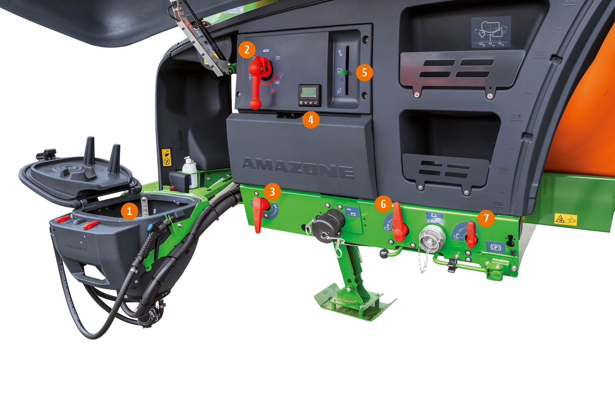 - Remplissage confortable de la cuve à bouillie et cuve de rinçage avec stop de remplissage automatique