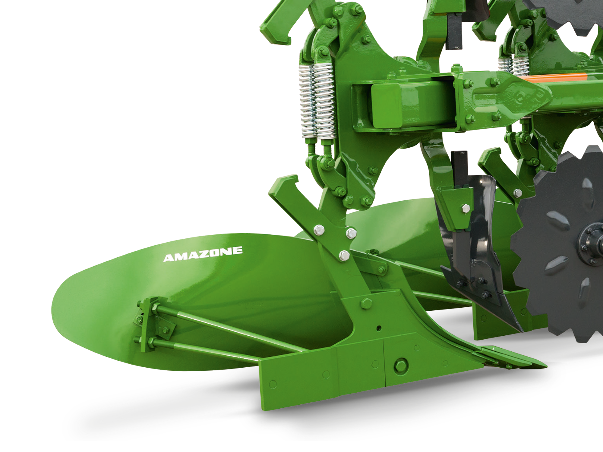 Au niveau de la sécurité anti-pierre semi-automatique, le pivotement du corps de labour est réalisé en surmontant la forte pression du ressort exercée par 2 ressorts spiralés. Si le sol n’est pas trop pierreux, ce système représente sur la Cayros M une alternative entre la sécurité anti-pierre par boulon de cisaillement et celle hydraulique.