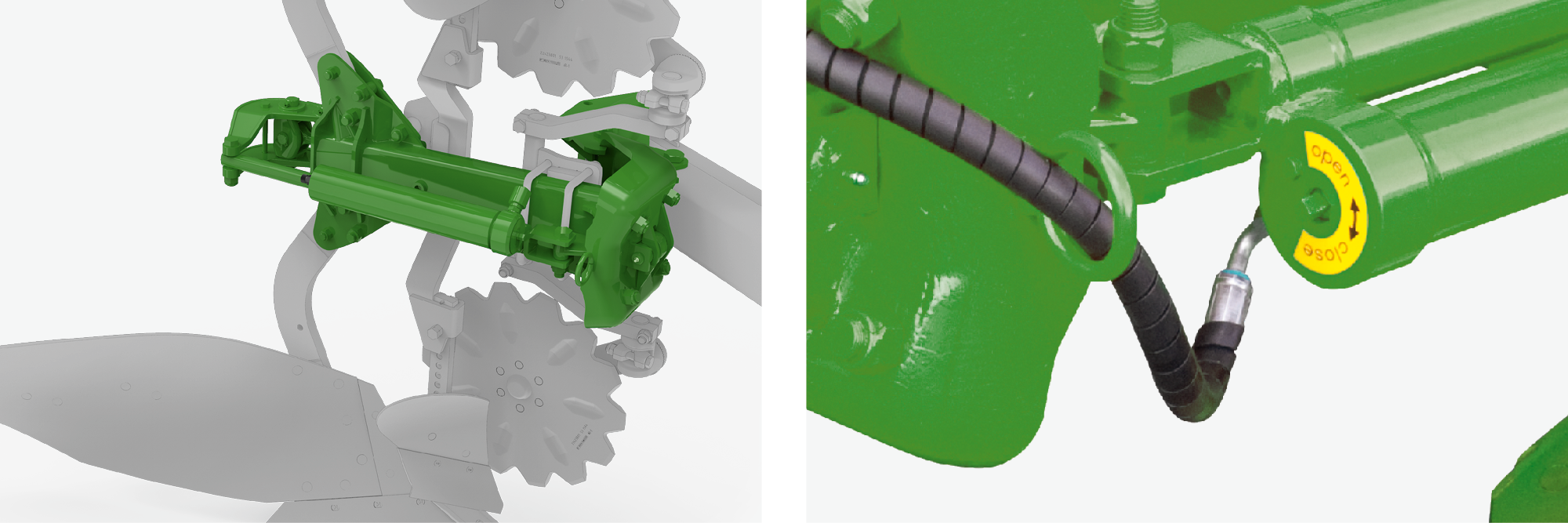 La sécurité non-stop hydraulique est dotée par principe, sur chaque paire de corps, d’un vérin hydraulique avec accumulateur hydraulique rempli d’azote et directement relié. En cas de déclenchement, le corps de labour pousse, via le vérin hydraulique, un piston dans l’accumulateur. Le gaz est comprimé et ramène automatiquement le corps en position initiale une fois l’obstacle franchi. La sécurité hydraulique est disponible pour les plus petites charrues, mais aussi pour les grands modèles.