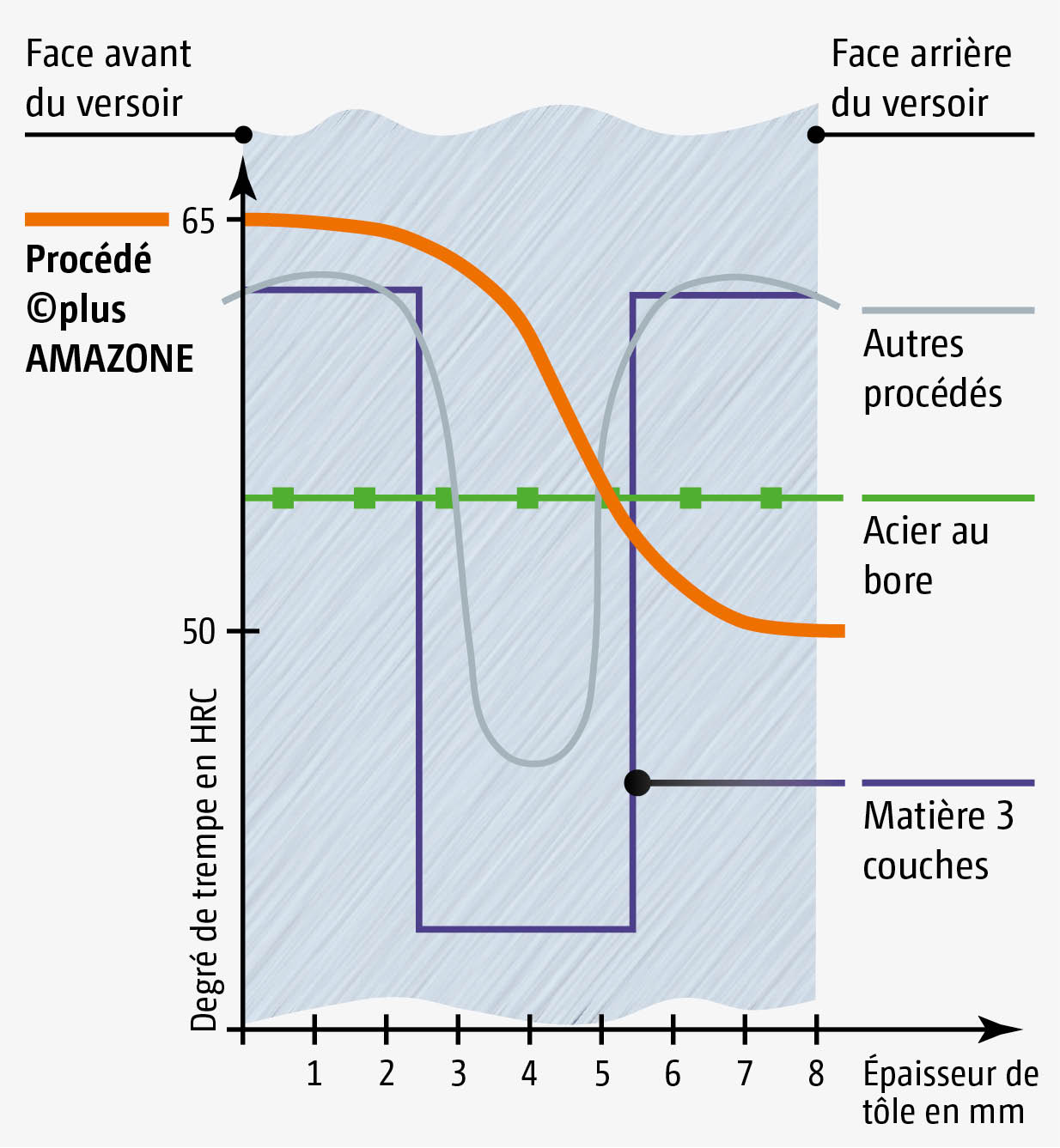 Le carbone sous sa forme la plus pure, de même que le diamant, sont les matériaux les plus durs que la nature produise. En introduisant le carbone en plus, les pièces d’usure ©plus sont nettement plus dures et leur longévité est renforcée. Grâce à son procédé de trempe unique en son genre, AMAZONE atteint par exemple sur la face avant du versoir une dureté très importante ce qui signifie une résistance exceptionnelle à l'usure. La face arrière reste relativement souple et de ce fait également extrêmement solide et résistante aux chocs.