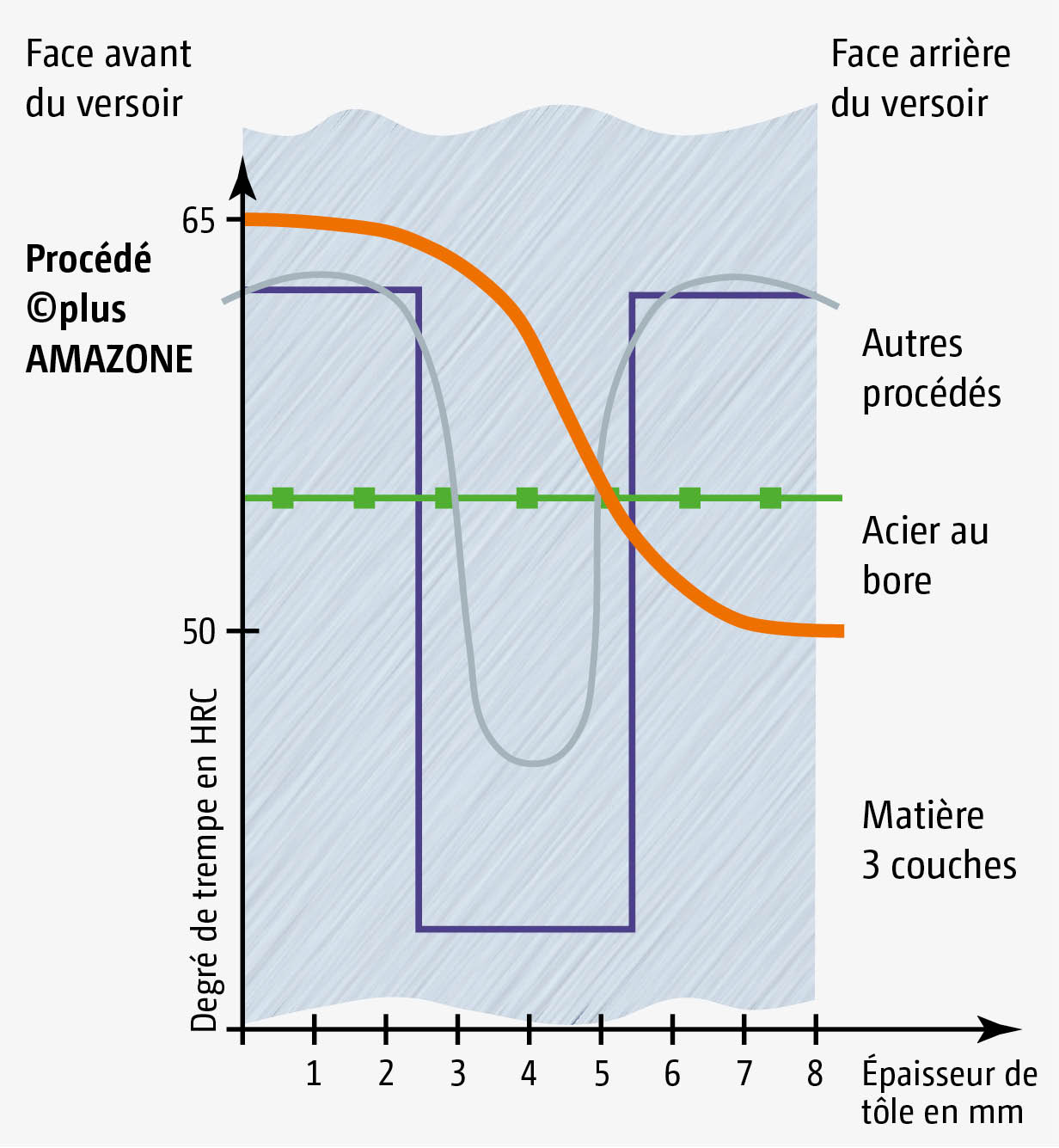Le carbone sous sa forme la plus pure, de même que le diamant, sont les matériaux les plus durs que la nature produise. En introduisant le carbone en plus, les pièces d’usure ©plus sont nettement plus dures et leur longévité est renforcée. Grâce à son procédé de trempe unique en son genre, AMAZONE atteint par exemple sur la face avant du versoir une dureté très importante ce qui signifie une résistance exceptionnelle à l'usure. La face arrière reste relativement souple et de ce fait également extrêmement solide et résistante aux chocs.