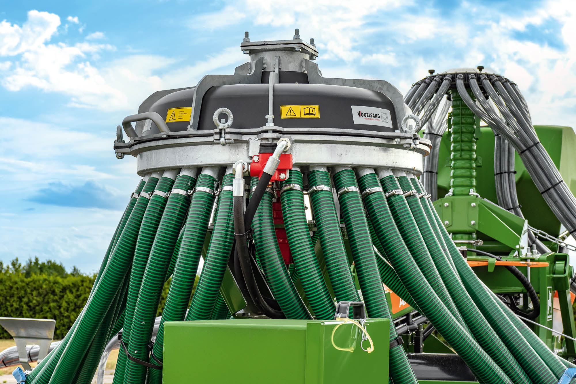 Le Catros pro peut être combiné avec un répartiteur SynCult DosiMat DMX de la société Vogelsang. Celui-ci se caractérise par des débits importants, jusqu'à 10 000 l/min, et une précision de distribution élevée et constante, quel que soit le débit. La tête et les tuyaux de descente du répartiteur sont montés de manière permanente sur le châssis adaptateur jusqu’à la première rangée de disques du Catros. Le montage est effectué par AMAZONE directement en usine.