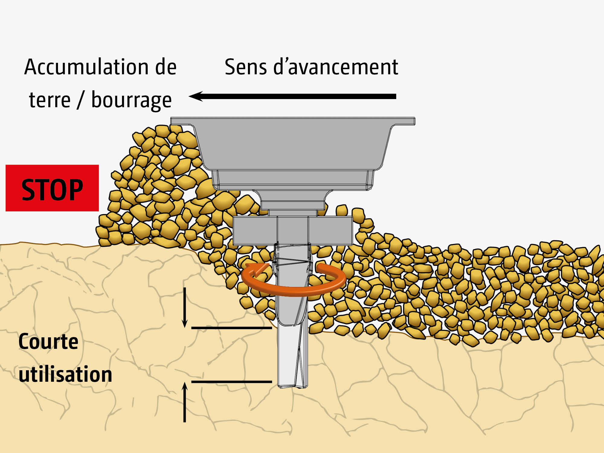 Les "dents pointées en avant" ouvrent le sol de bas en haut. Il n’y a pas d’effet de lissage. Les mottes de terre grossières sont rejetées plus loin que les mottes fines.
