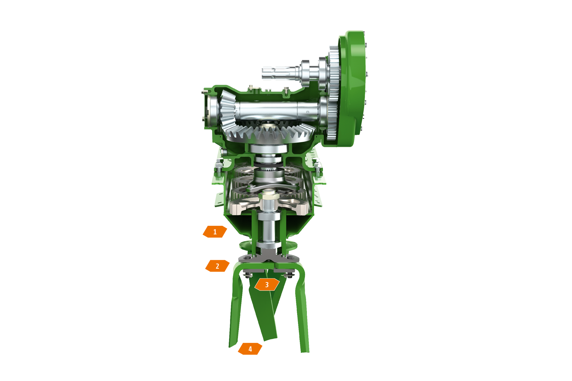 La boite de vitesses DirectDrive est la pièce maîtresse de la nouvelle KE 02, elle permet la transmission du flux de puissance supérieur directement sur les engrenages des toupies de la herse rotative. Comme sur les cultivateurs rotatifs KX et KG, le trajet est rectiligne, garantissant une très bonne transmission de puissance et une faible usure. Sur les KE 02-2 repliables, la boîte de vitesses est logée sur les deux bras. La herse rotative peut travailler à des régimes de prise de force de 540/750/1 000. Des jeux d'engrenages interchangeables pour d'autres vitesses de rotation sont possibles. Des régimes plus élevés améliorent les performances d’émottage.