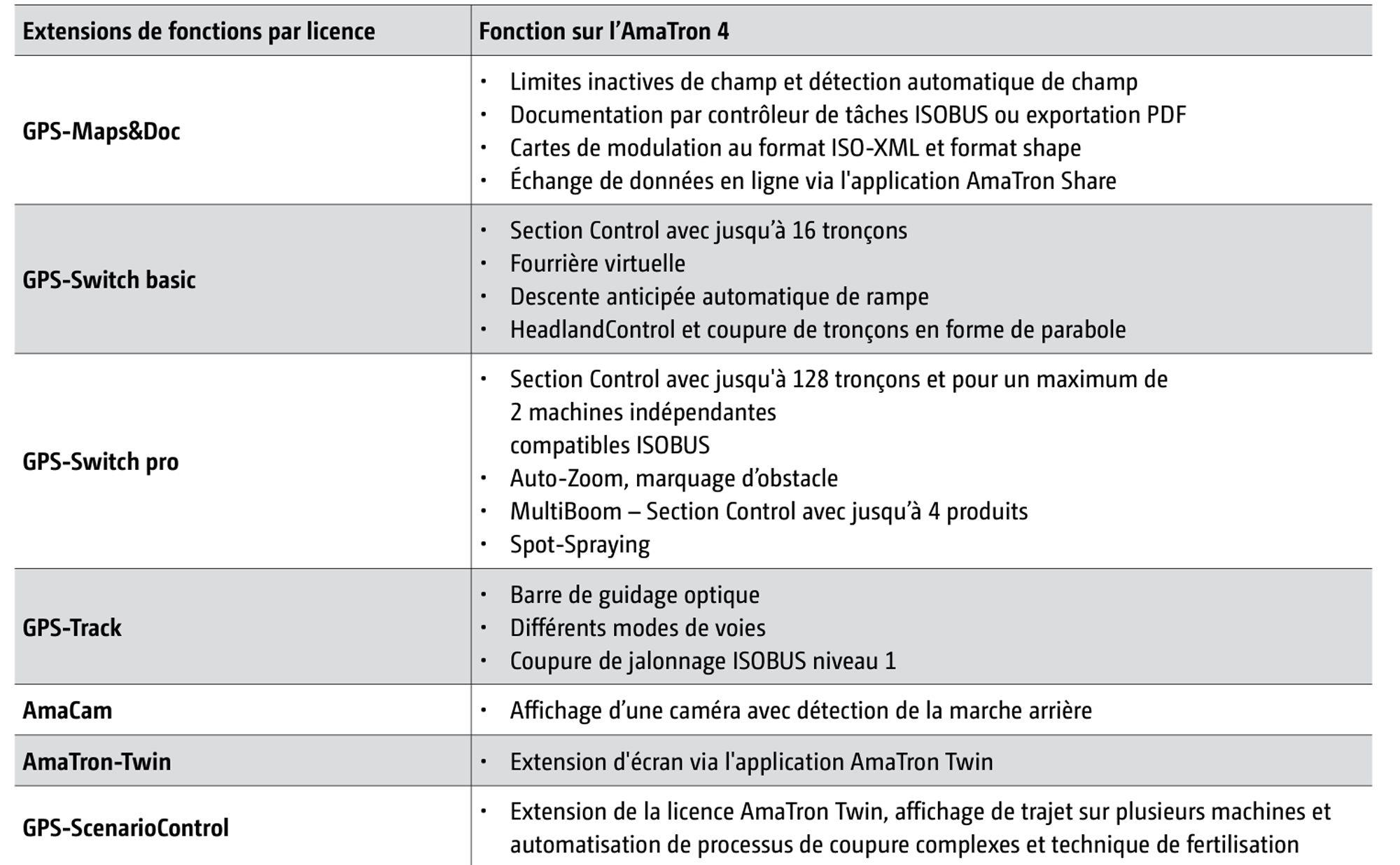 Logiciel polyvalent, que cela soit pour un pilotage ISOBUS pur de la machine ou pour les fonctions en lien avec l’agriculture de précision, l’AmaTron 4 offre en standard ou en option différentes licences de logiciel et répond ainsi à toutes les exigences. Toutes les licences sont préinstallées sur l’AmaTron 4 et peuvent être testées gratuitement ou être activées directement moyennant paiement.