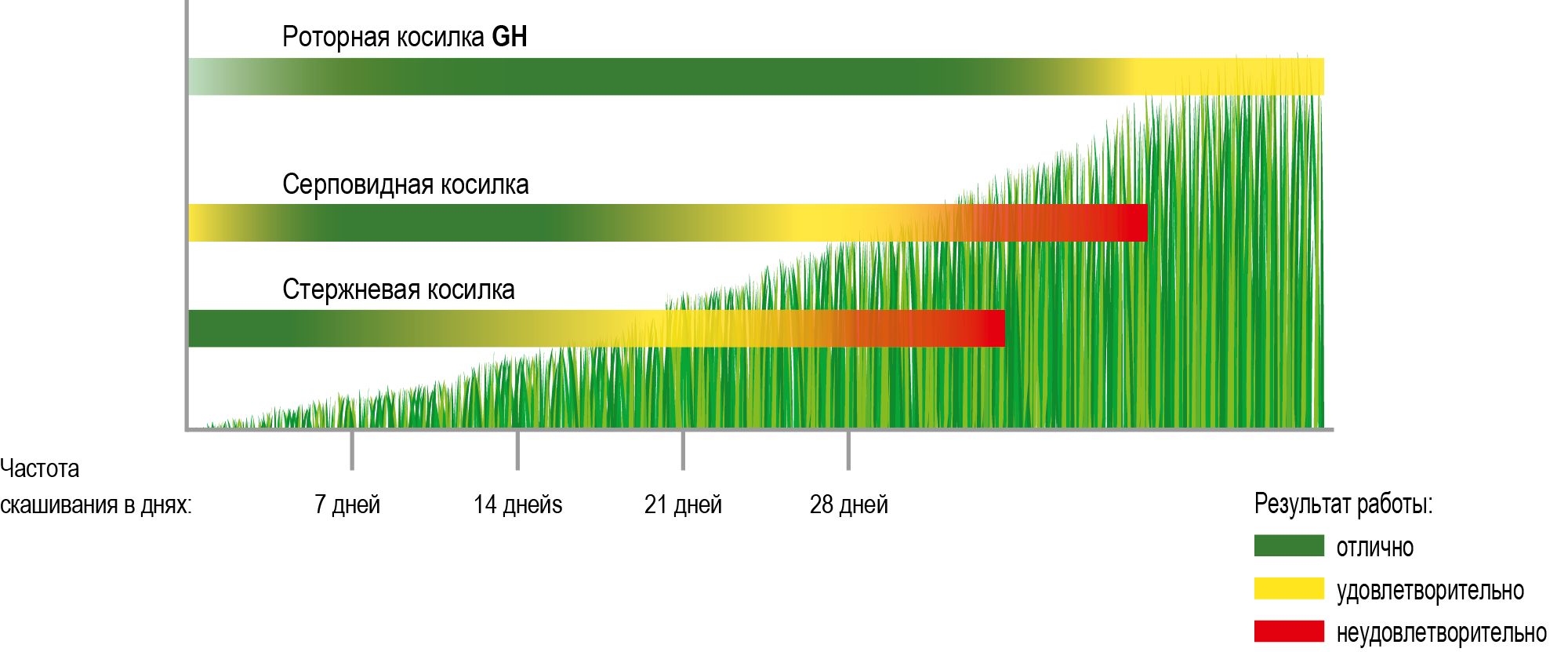 В отличие от серповидной и стержневой косилки, GH, как роторная косилка, с учетом технических причин работает очень надежно даже при значительно большей высоте среза. Как по короткой, так и по длинной траве GH обеспечивает идеальную картину среза.