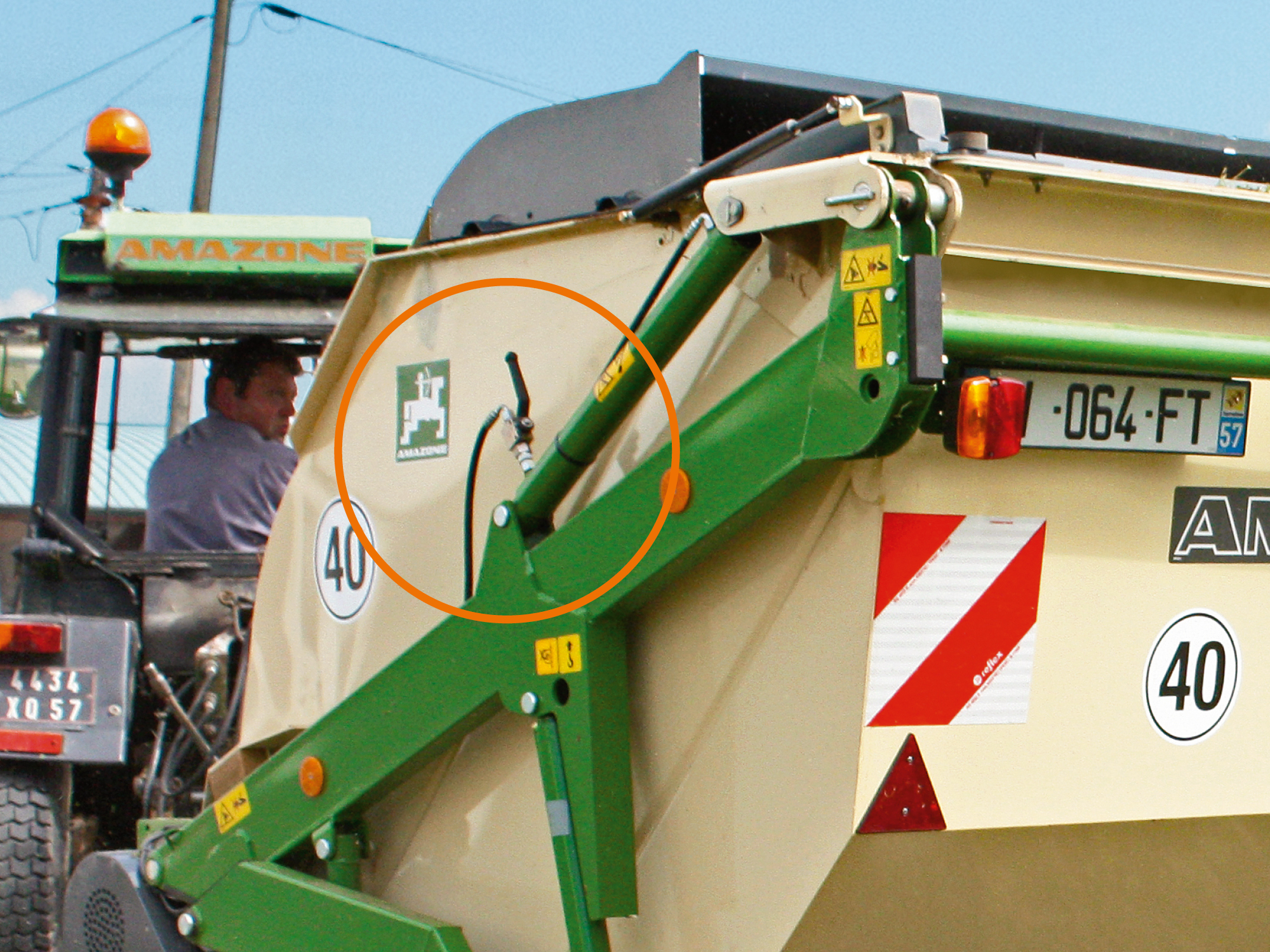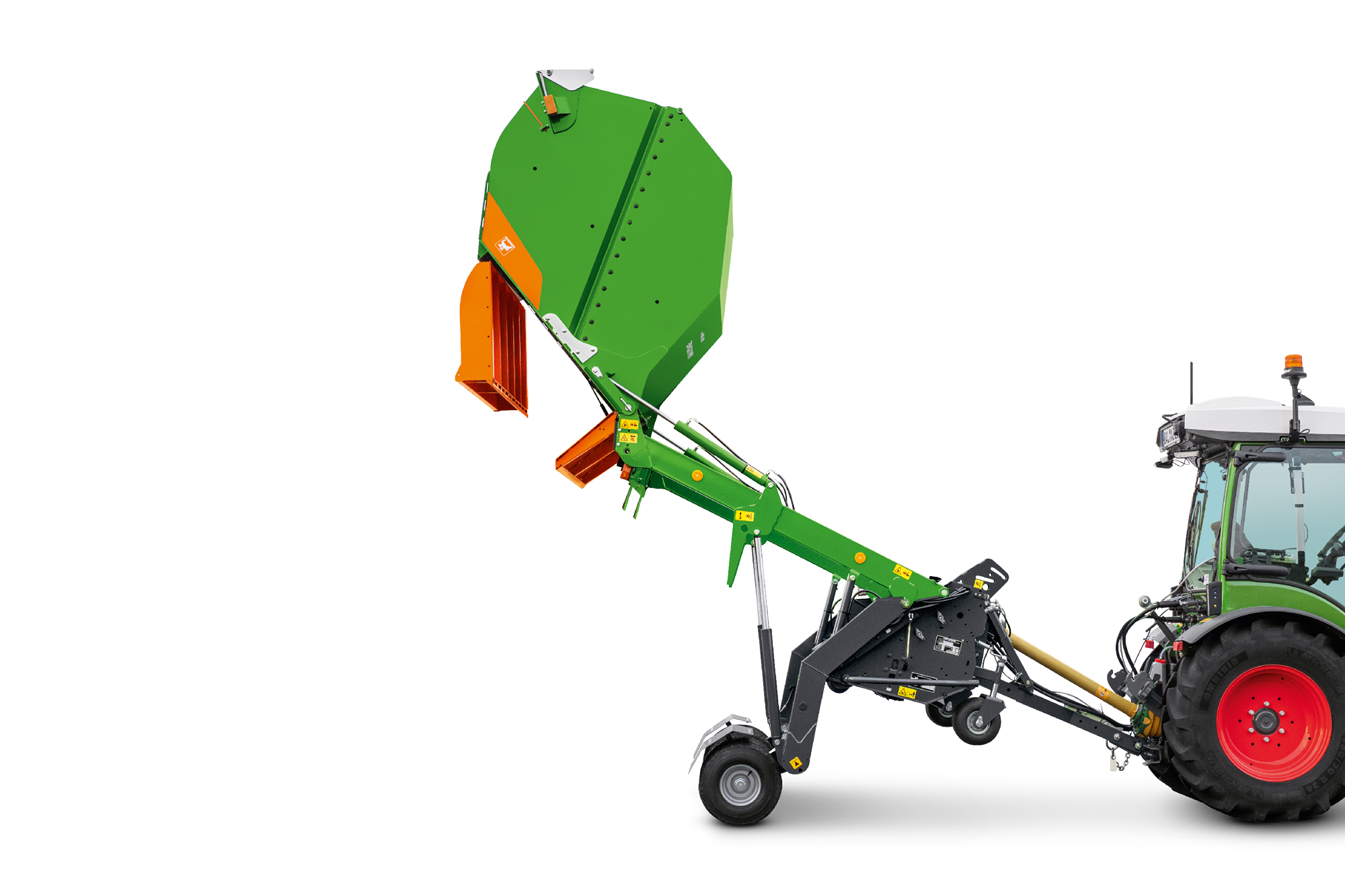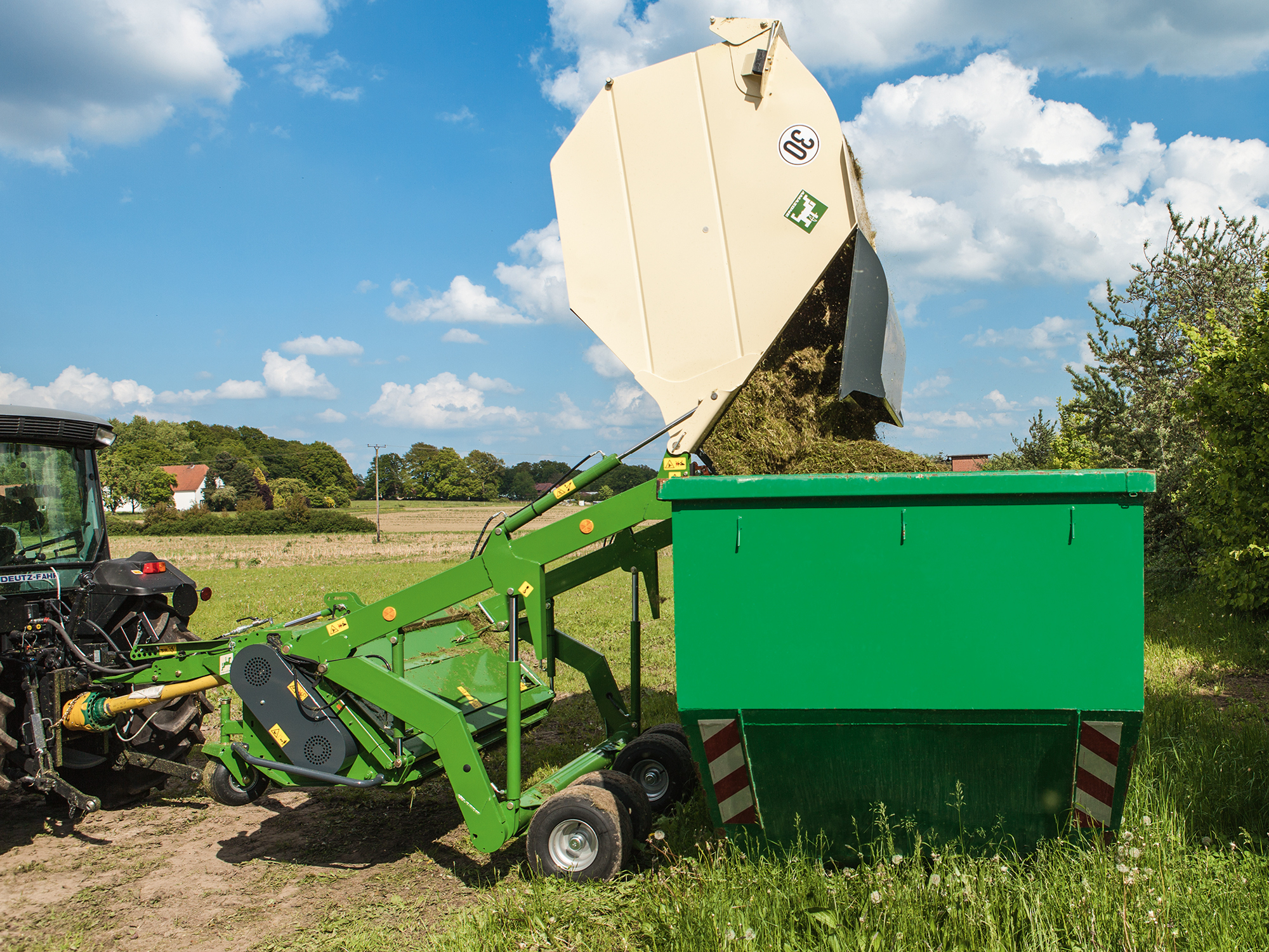 Опустошить бункер можно просто и удобно, из кабины трактора. Точка перегрузки смещена далеко назад, так что возможно надежное заполнение высоких контейнеров и прицепов высотой до 2,30 м. Гидравлический фиксатор позволяет проводить под приподнятым бункером безопасную работу у ротора или бункера-накопителя.