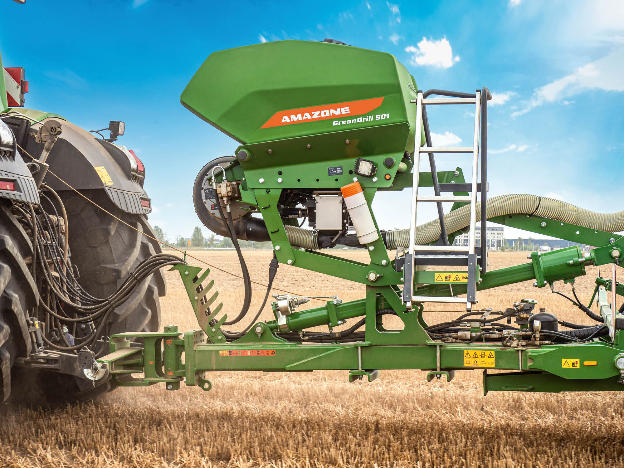 Для обеспечения возможности посева промежуточных культур непосредственно во время почвообработки компания AMAZONE предлагает задненасадной бункер GreenDrill 501 объёмом 500 л, доступ к которому безопасно осуществляется по ступенькам.