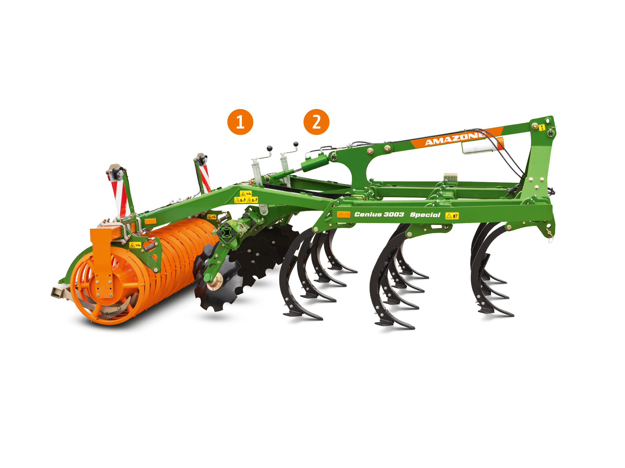 Настройка глубины обработки осуществляется серийно бесступенчато, механически, без инструментов, централизованно на одном месте на орудии с помощью рукоятки. Для ориентировки при настройке глубины обработки служит наглядная и прочная шкала. Дополнительно Cenius предлагается также с гидравлической регулировкой глубины.